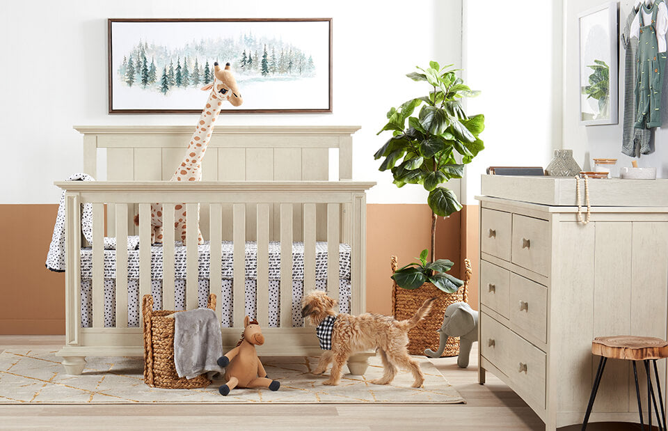 À part un lit de bébé, choisissez des meubles qui dureront plus longtemps. Par exemple, une commode pleine grandeur plutôt qu’une table à langer continuera de s’agencer au décor de la chambre tandis que votre enfant grandit. Tout ce dont vous avez besoin pour transformer cette commode en table à langer est simplement d’ajouter un coussin à langer et un plateau à langer pour vos articles essentiels pour changer bébé.