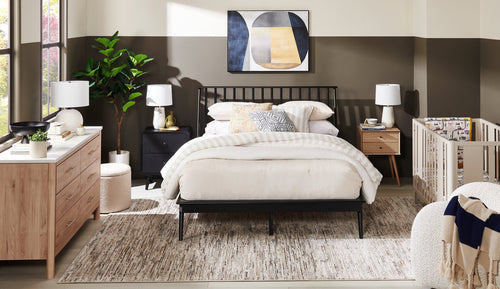 Un refuge apaisant et moderne qui met en vedette un cadre de lit en métal noir, un fauteuil douillet d’aspect bouclé, des touches de bois chaleureux et de douces teintes neutres. Il est parfait pour se reposer et passer des moments avec bébé.