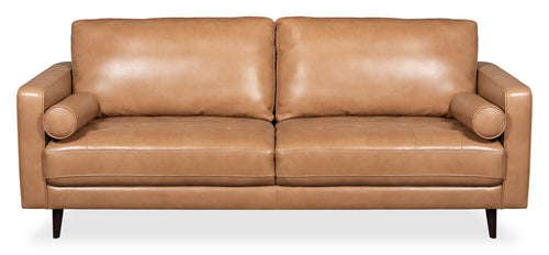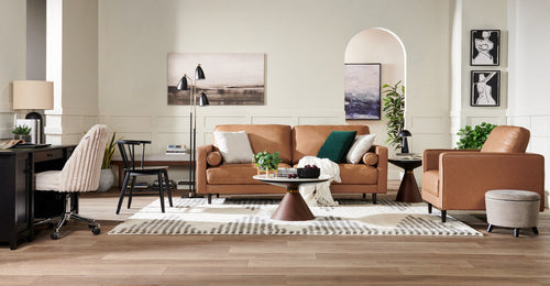 Le chaleureux cuir brun se marie aux lignes scandinaves épurées pour créer un décor douillet et moderne.