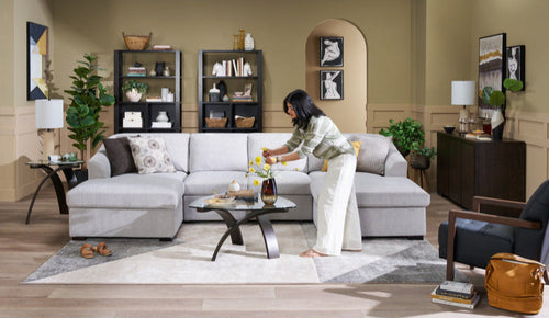 Blottissez-vous avec style grâce aux teintes chaleureuses, aux bois riches et au sofa sectionnel assorti parfait.