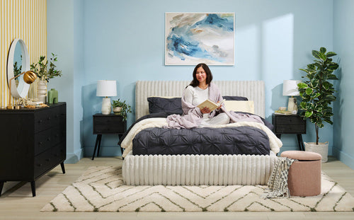Cette chambre à coucher amusante et colorée combine teintes ludiques et confort moderne.