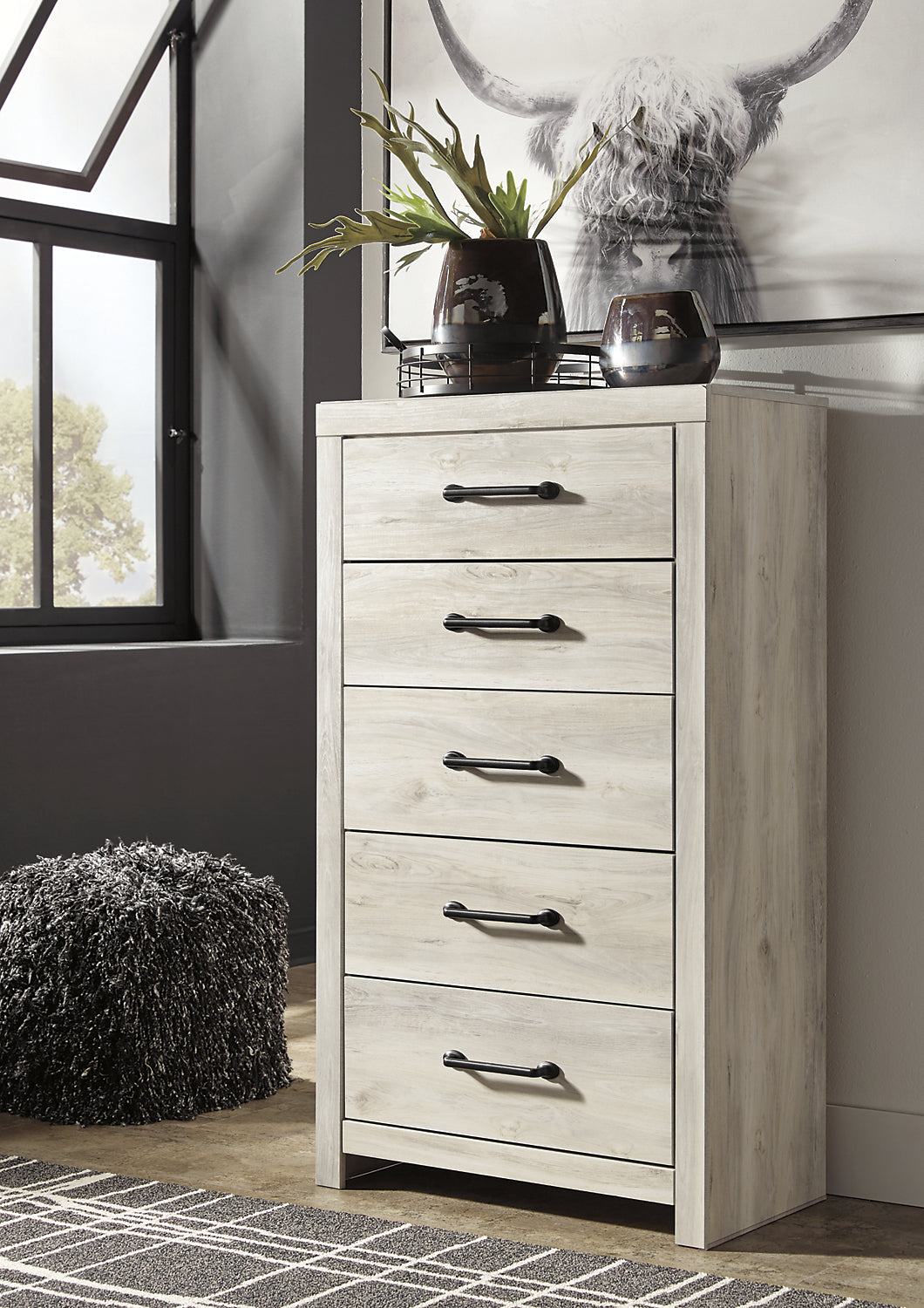 | Options de rangement | Cette commode verticale possède cinq tiroirs spacieux. |