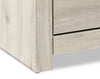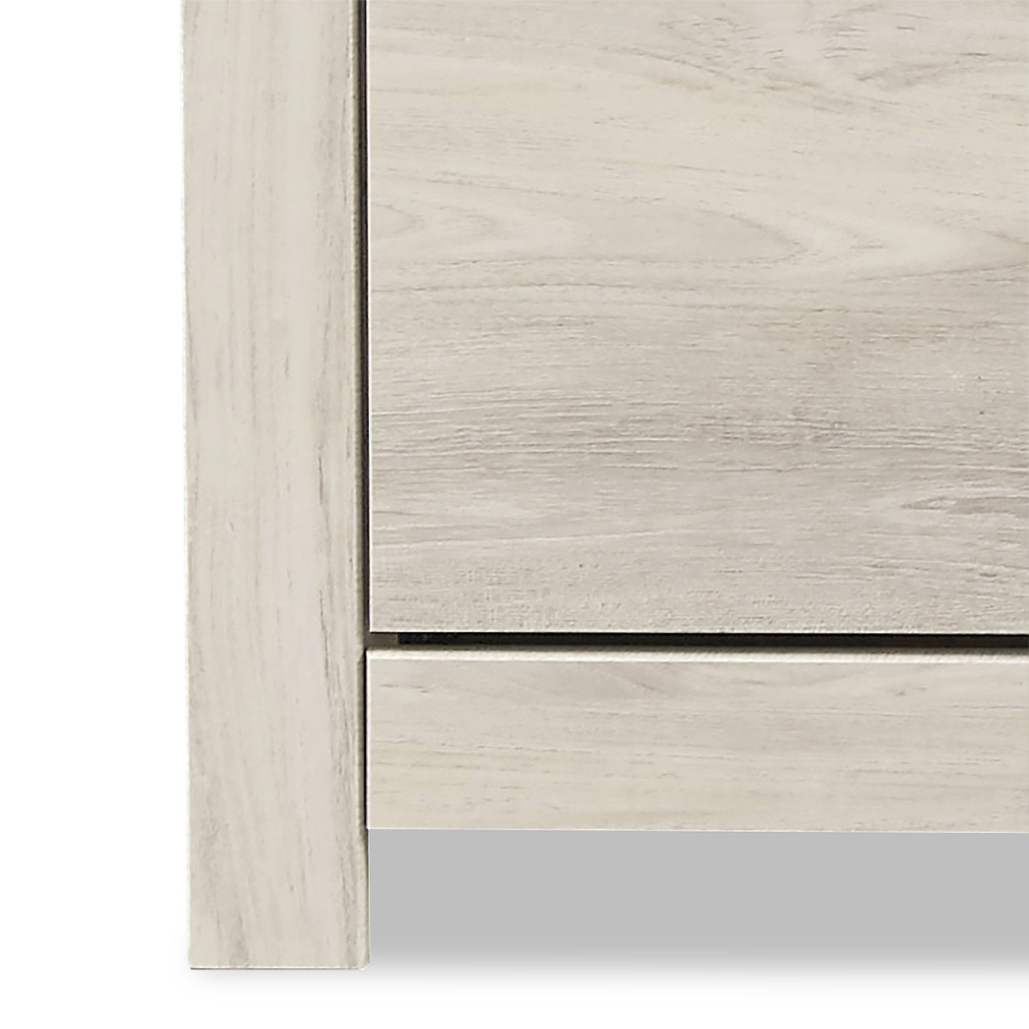| Quincaillerie | De longues poignées foncé ornent le devant des tiroirs. |