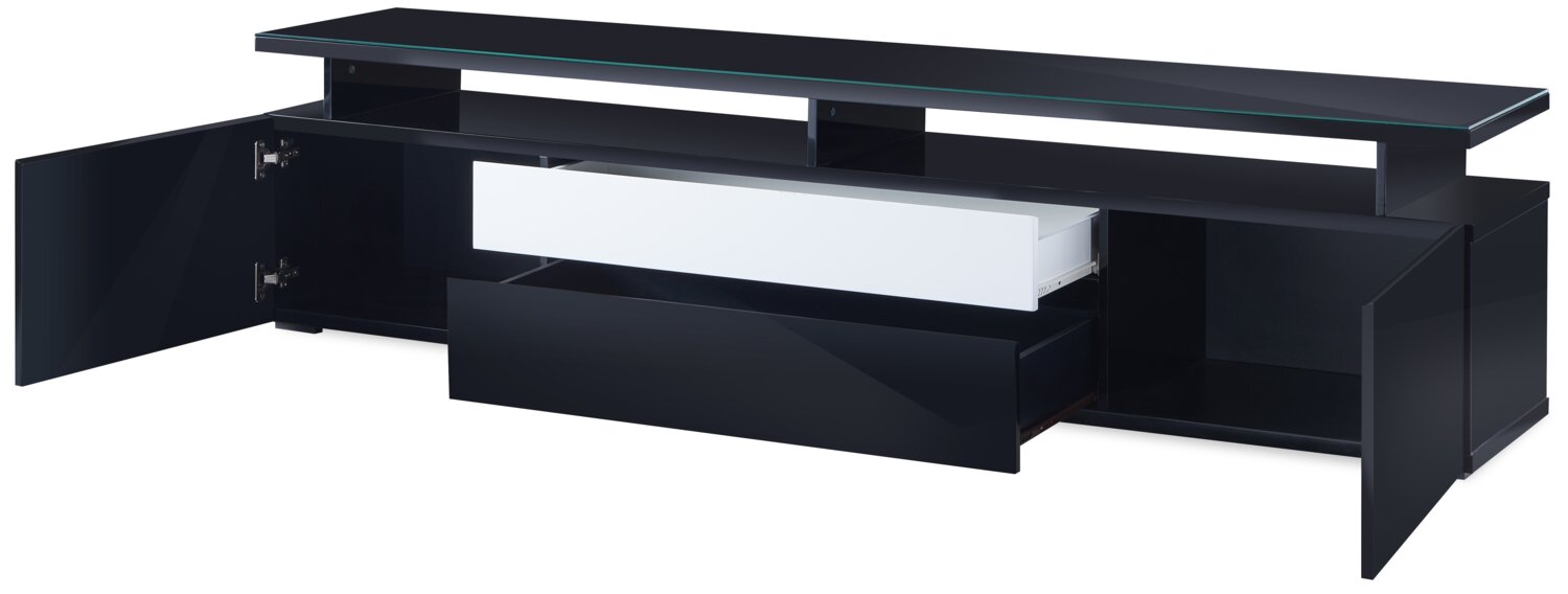 | Détails décoratifs | Pour un attrait visuel, le tiroir supérieur est blanc pour faire contraste avec le reste du meuble pour téléviseur noir. |