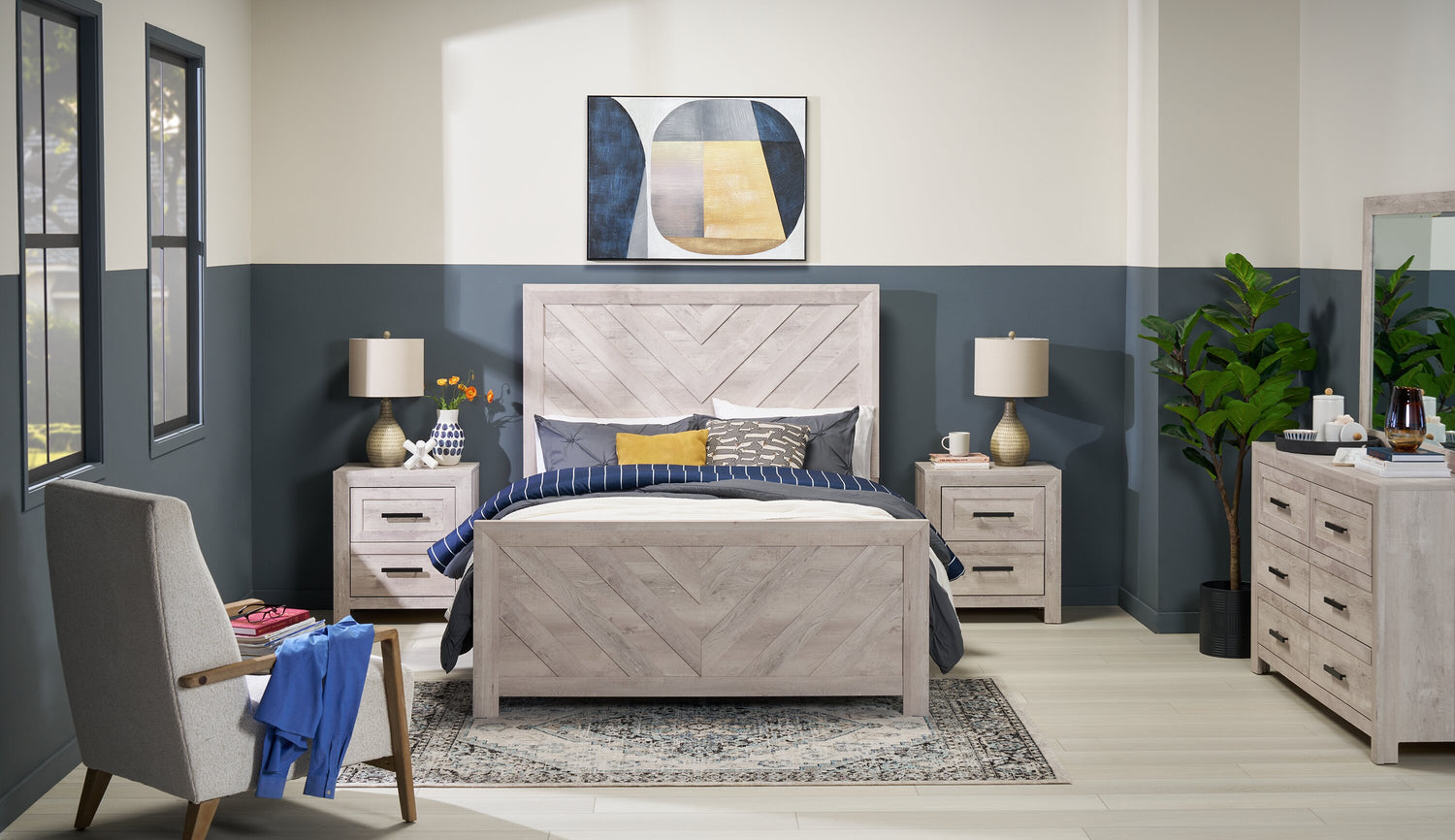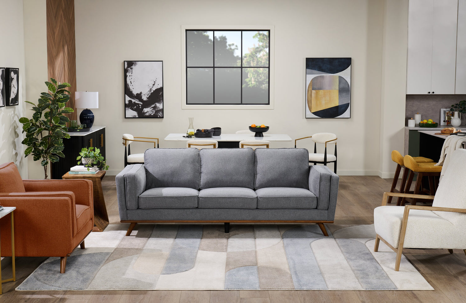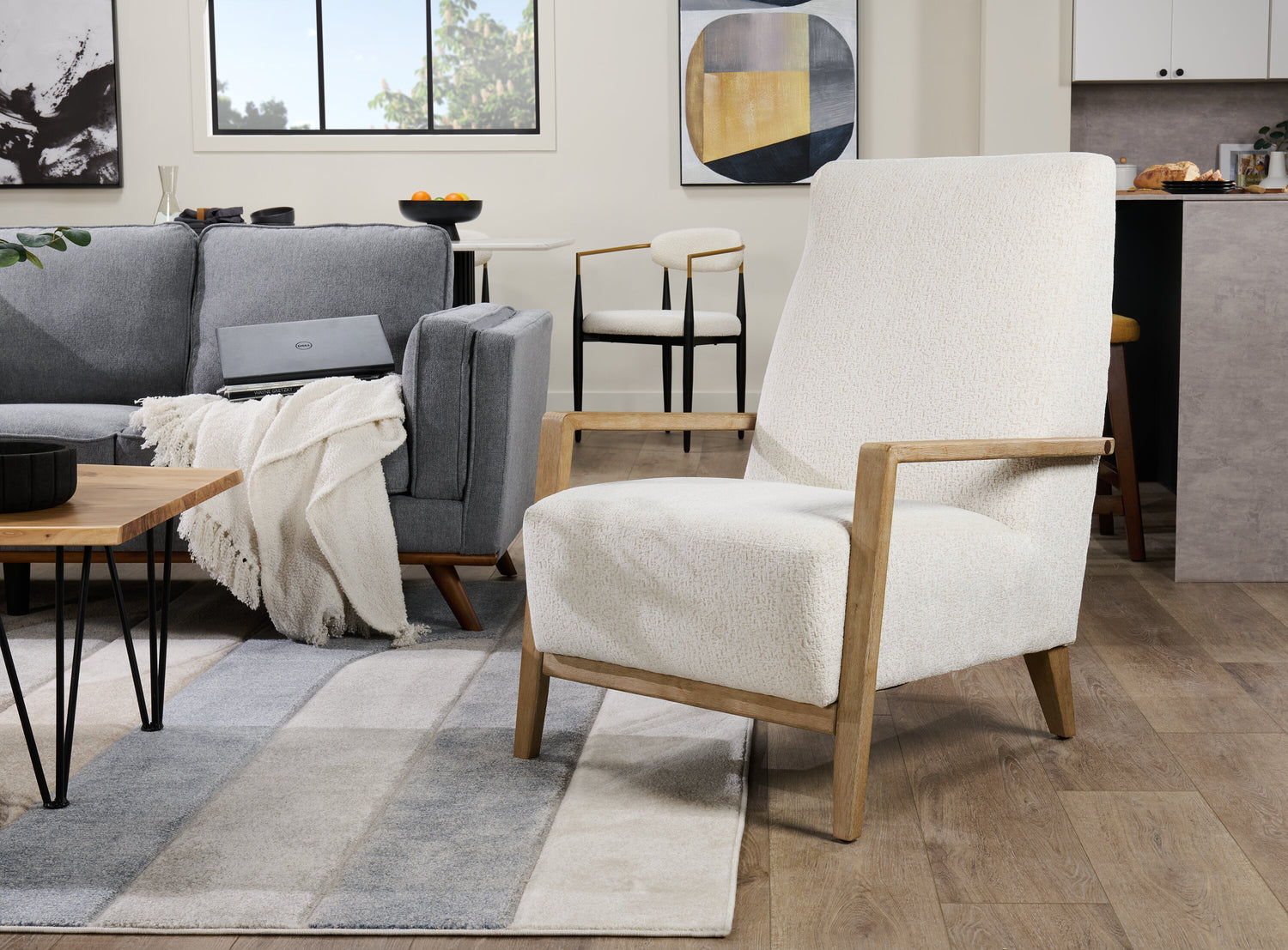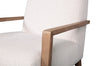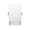 | Détails décoratifs | Le revêtement blanc albâtre s'agence bien au bois naturel des accoudoirs et des pattes. |