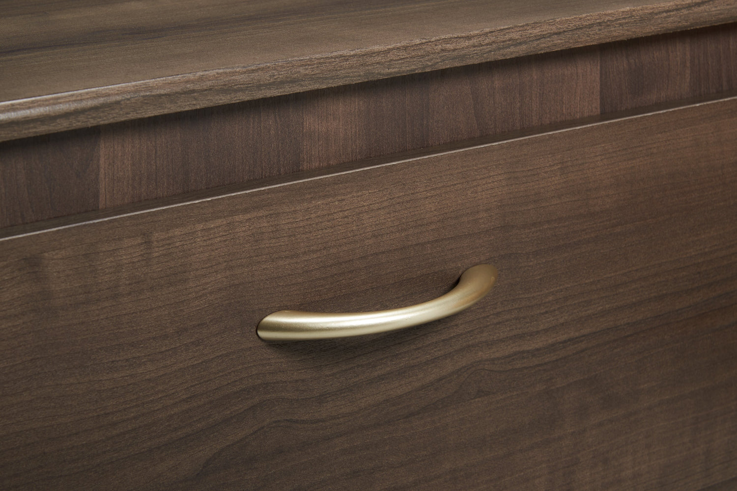 | Quincaillerie | Des poignées rectangulaires en étain brillant ornent le devant des tiroirs. |