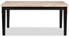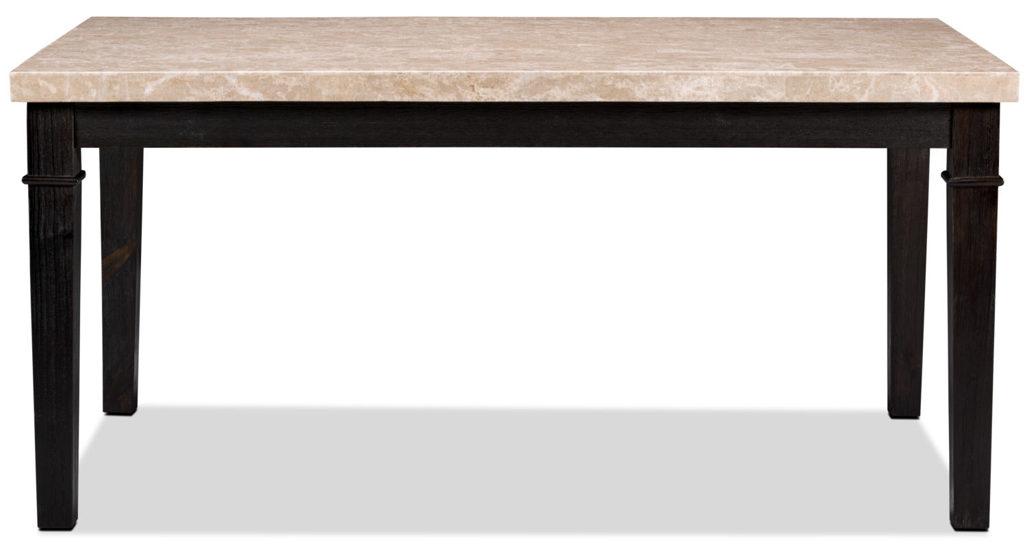 Les pattes et la ceinture de la table possèdent un fini teint gris brun qui a été appliqué à la brosse métallique afin de conférer une allure rustique et mature à ce meuble. Telle une chevelure poivre et sel, les nuances de gris aident à adoucir le brun, créant ainsi un agréable contraste avec le marbre beige.
