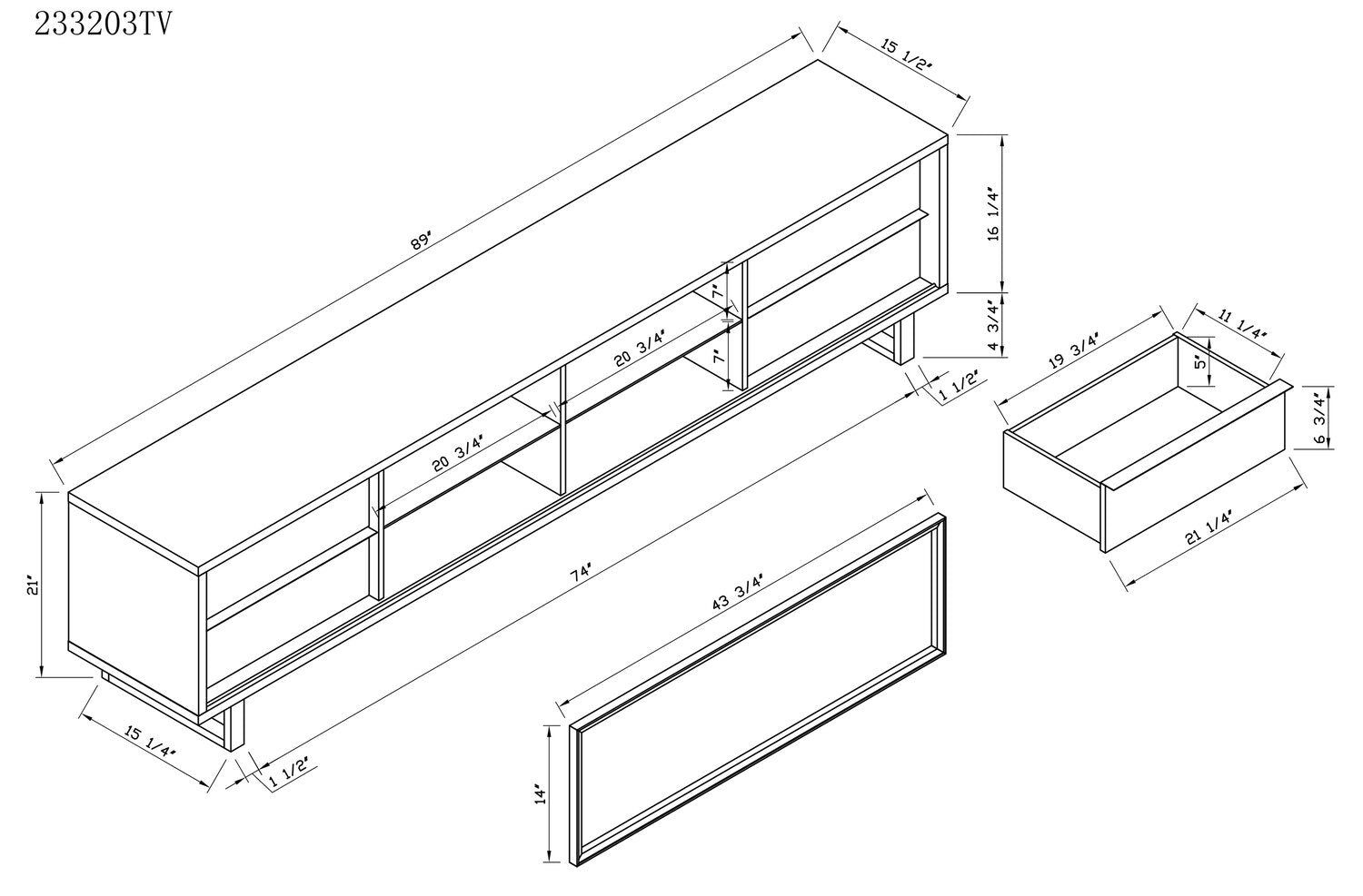 Largeur : 89 po (226,1 cm) Hauteur : 21 po (53,3 cm) Profondeur : 15,5 po (39,4 cm)