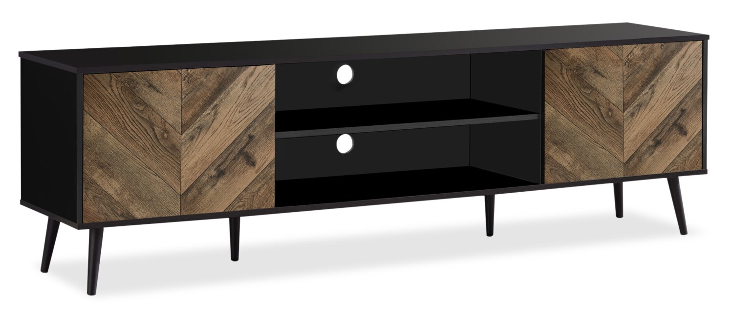 | Détails décoratifs | Pattes en bois massif et un fini à deux teintes avec rainures en V sur les portes d'armoires. |