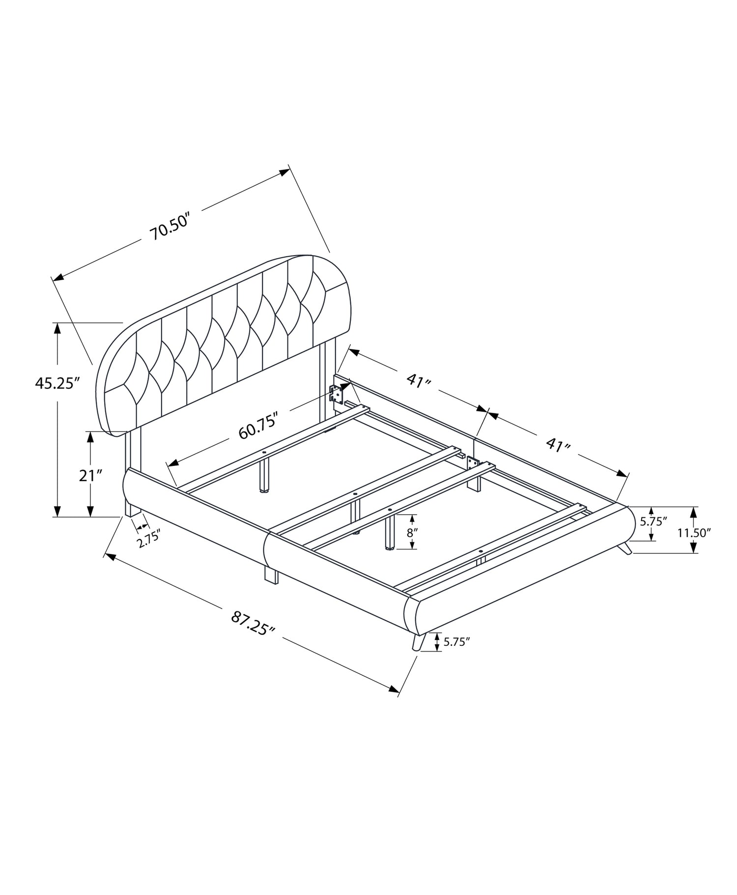 Largeur : 25 po (63,5 cm) Hauteur : 7 po (17,8 cm) Profondeur : 72 po (182,9 cm)