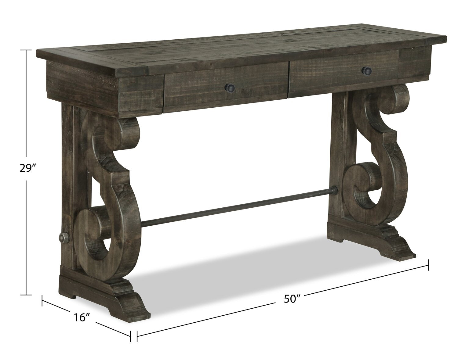 Largeur : 50 po (127,0 cm) Hauteur : 29 po (73,7 cm) Profondeur : 16 po (40,6 cm)