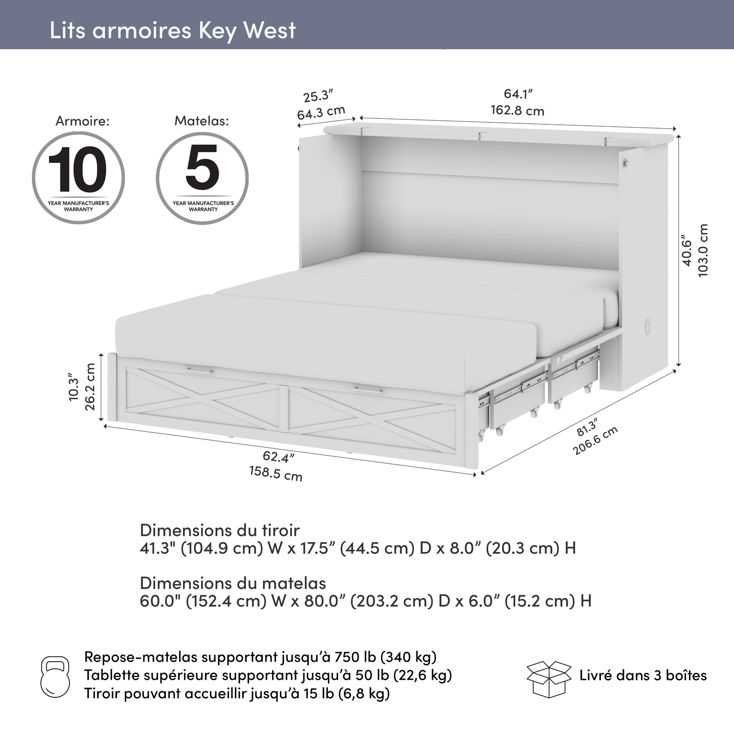 Largeur : 67,75 po (172,1 cm) Hauteur : 12,81 po (32,5 cm) Profondeur : 28,13 po (71,5 cm)