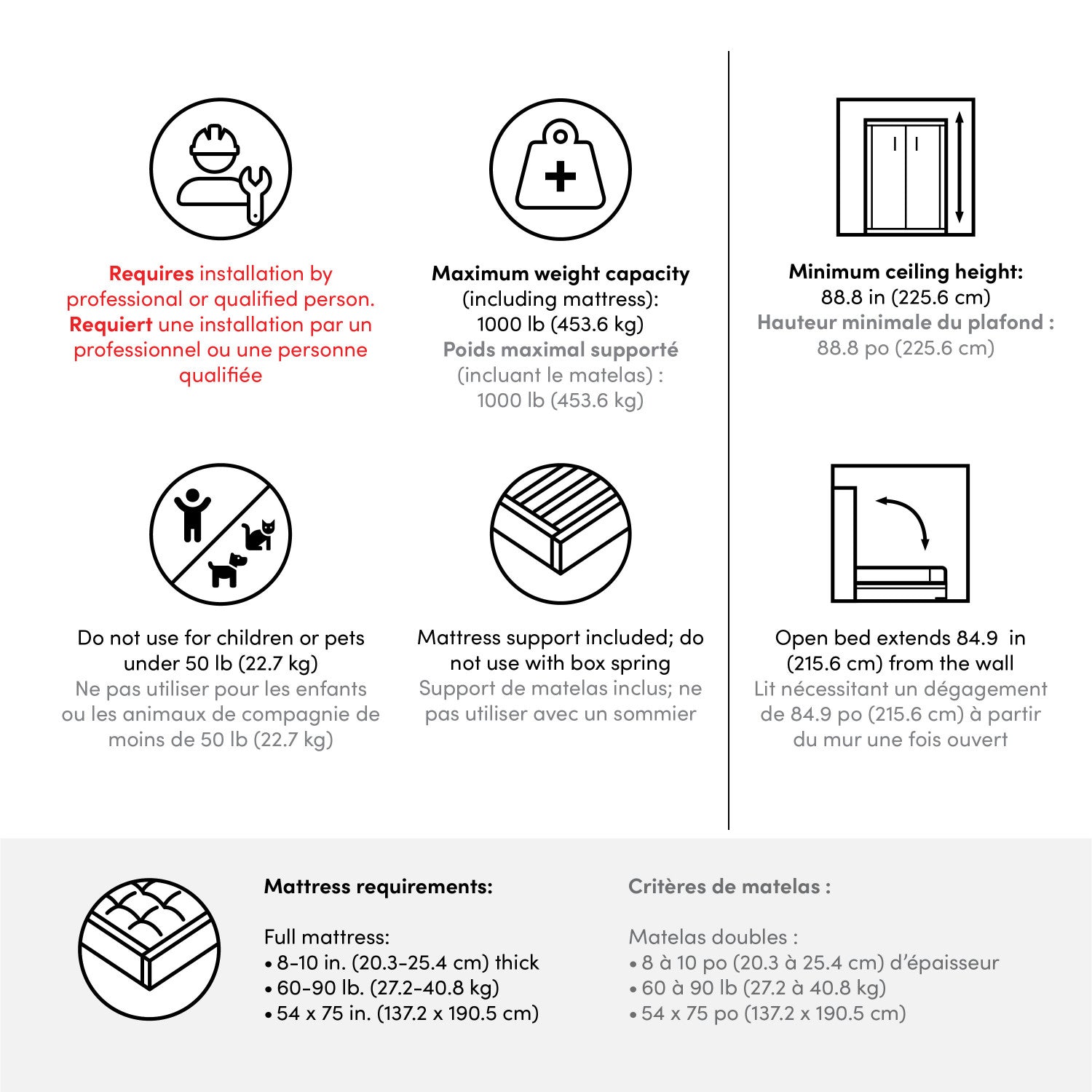Largeur : 63,35 po (160,9 cm) Hauteur : 84,96 po (215,8 cm) Profondeur : 84,90 po (215,6 cm)