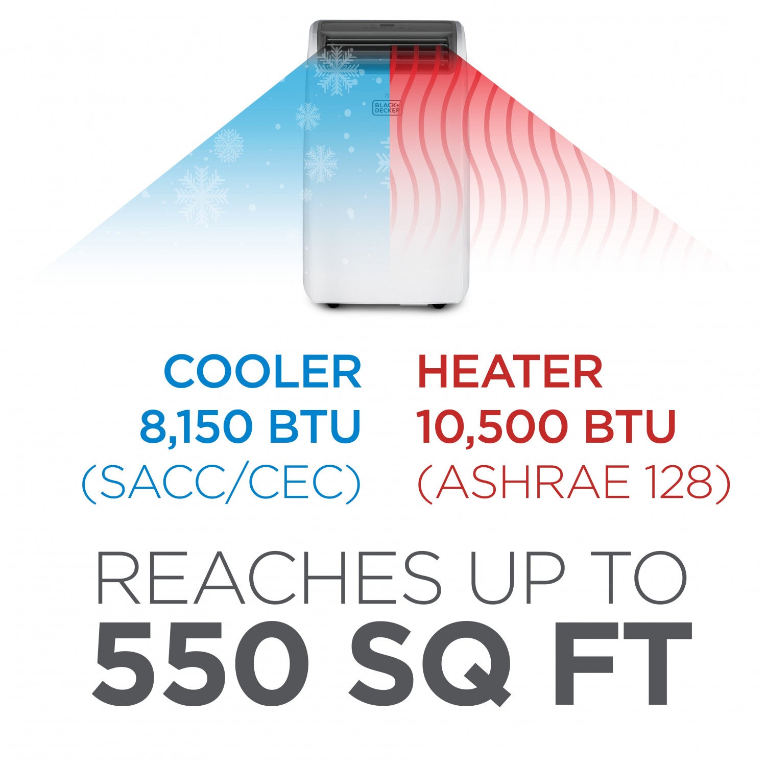 Profitez de rafraîchissement et de chauffage rapides, faciles et confortables de la demeure pour une régulation du climat saisonnier toute l’année grâce à nos climatiseurs portatifs de pièce polyvalents de Black+Decker. Le climatiseur portatif Black+Decker refroidit, chauffe, déshumidifie et fait circuler l’air afin de combattre la chaleur estivale et les nuits froides d’hiver. Le climatiseur sur pied avec chaleur garde de nombreuses pièces, les chambres principales, les appartements ou même les garages pour deux voitures confortables. Convient seulement aux fenêtres à guillotine à deux châssis mobiles ou aux fenêtres coulissantes et non aux fenêtres à l’anglaise. Nos climatiseurs portatifs pour pièces possèdent un panneau de commande électronique facile à utiliser et une télécommande dotée de toutes les fonctions pour une utilisation facile. La fonction Suivez-moi transforme votre télécommande en thermostat mobile afin de permettre une commande précise de la température. C’est comme avoir votre thermostat dans vos mains. Réglez la température, la vitesse du ventilateur et toutes les autres fonctions tout en maintenant une commande parfaite de la température là où vous êtes et là où vous en avez le plus besoin. Le climatiseur portatif inclut des roulettes pivotantes et des poignées de transport latérales pour une mobilité facile ainsi que tout ce qui est nécessaire pour une installation sans effort. Notre climatiseur d’intérieur possède quatre niveaux de rafraîchissement et trois vitesses de ventilateur ainsi que des évents pivotants automatiques (gauche et droite) afin d’aider à optimiser les niveaux de rafraîchissement au besoin. La fonction d’évaporation automatique de l’eau aide à retirer l’eau par le tuyau d’évacuation afin de réduire la quantité d’eau qui doit être vidée dans le seau d’eau ou le tuyau de vidange. Le climatiseur pour chambre à coucher possède également une minuterie de 24 heures pour démarrer et arrêter automatiquement l’appareil au besoin. Filtre amovible et lavable pour un nettoyage facile. Réfrigérant R-32. Les climatiseurs portatifs avec trousse pour fenêtre permettent une installation facile grâce au tuyau d’évacuation et aux panneaux coulissants de fenêtre inclus. Le climatiseur d’intérieur mesure 16,5 po (L) x 14,06 po (P) x 27,09 po (H) et pèse 56,1 lb. Homologué UL. Garantie de 1 an.