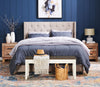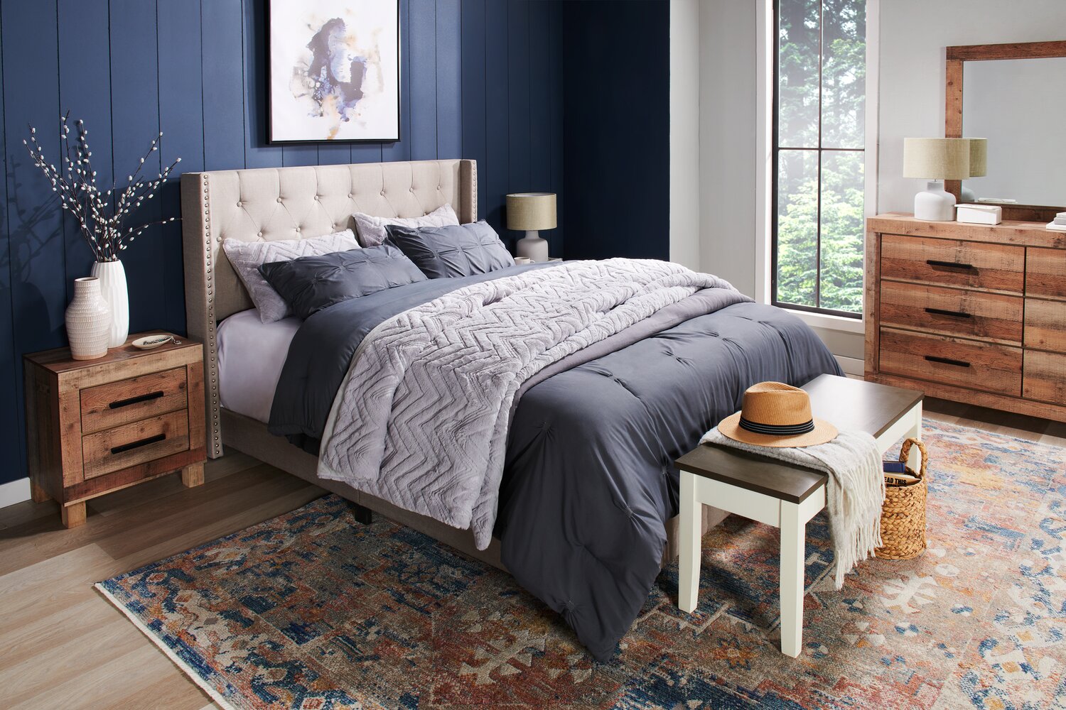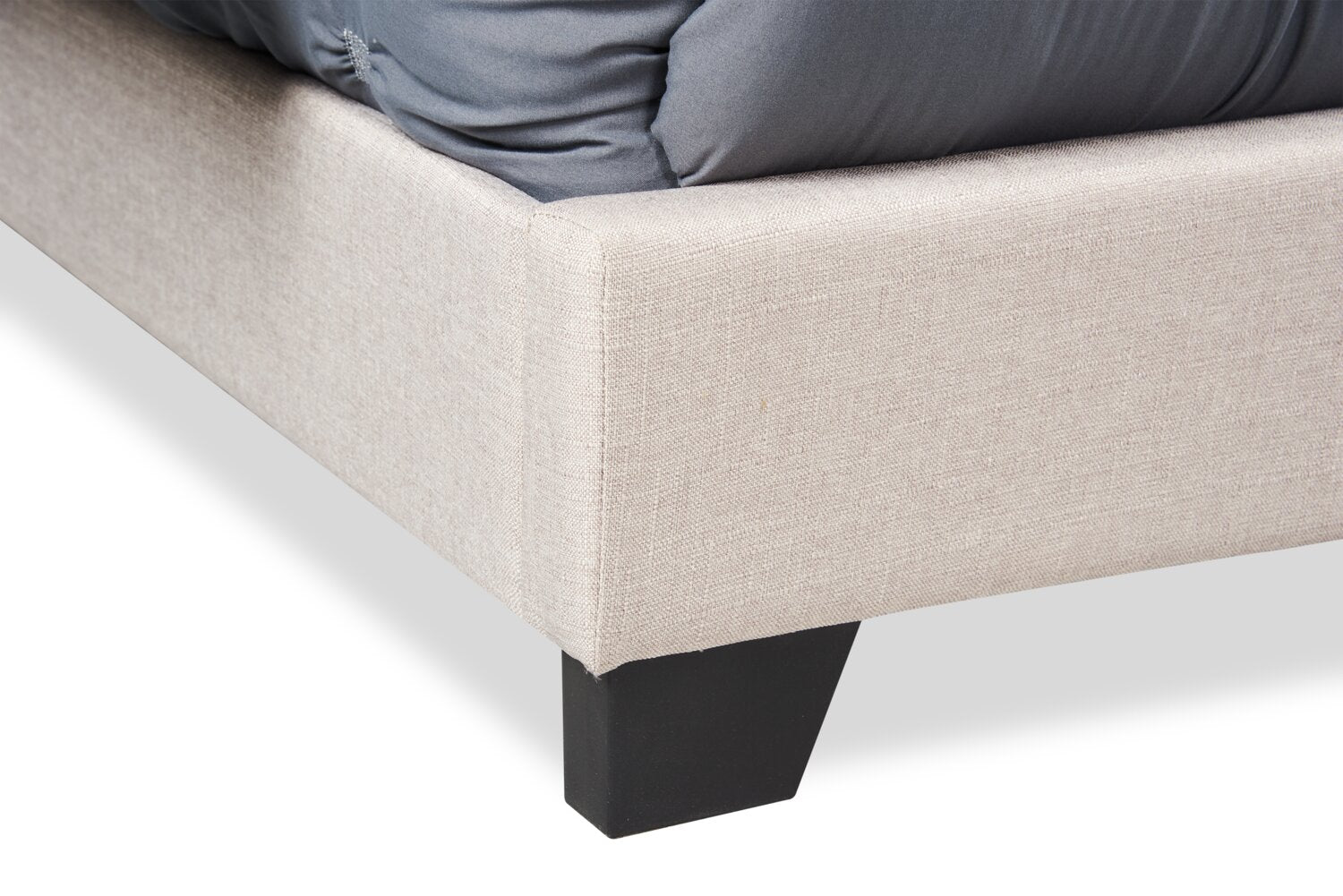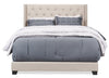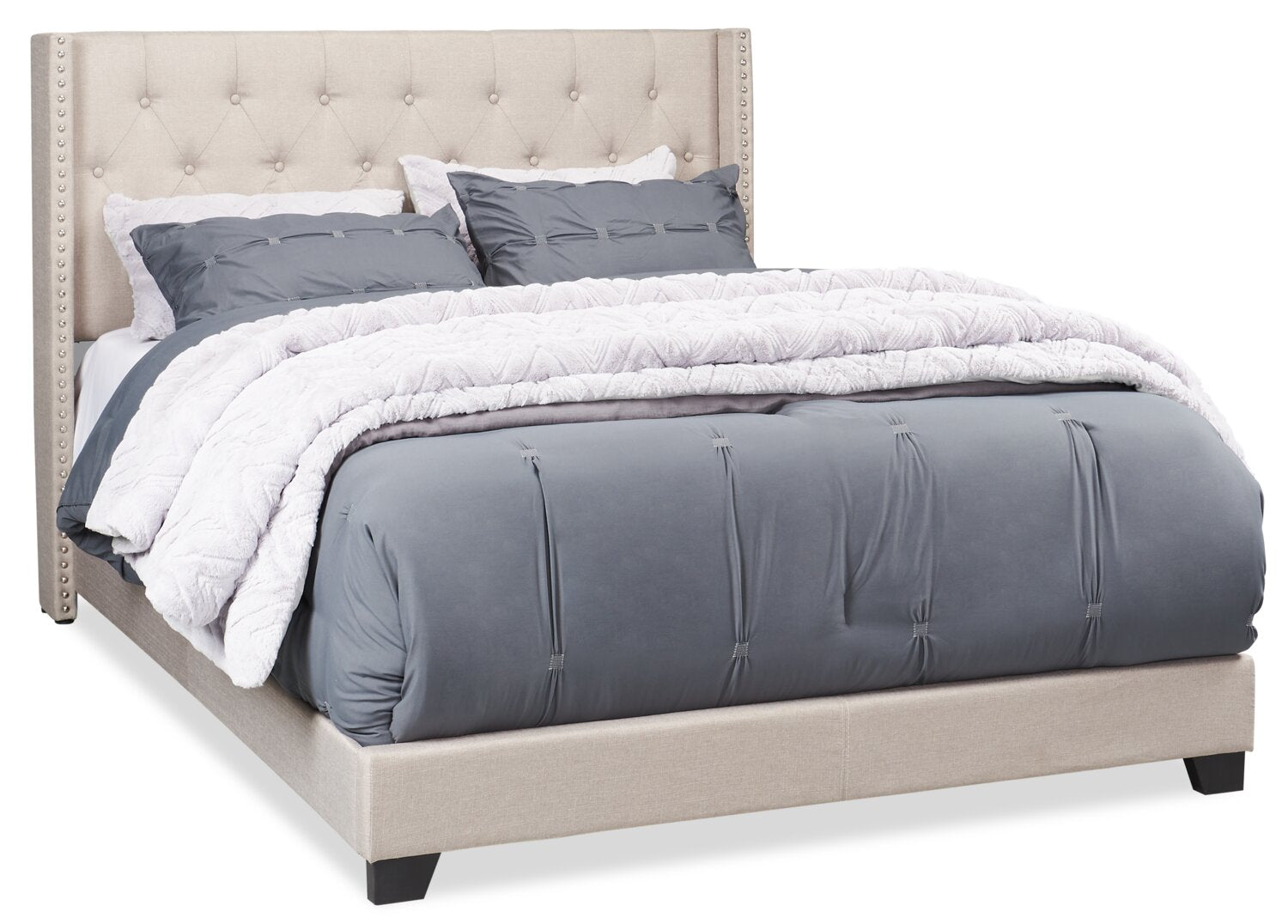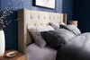 | Quincaillerie | Le fini chrome sur la tête de lit capitonnée ajoute des éléments éclatants à ce lit. |