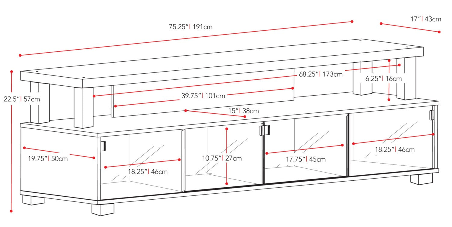 Largeur : 75,25 po (191,1 cm) Hauteur : 22,50 po (57,2 cm) Profondeur : 17,00 po (43,2 cm)