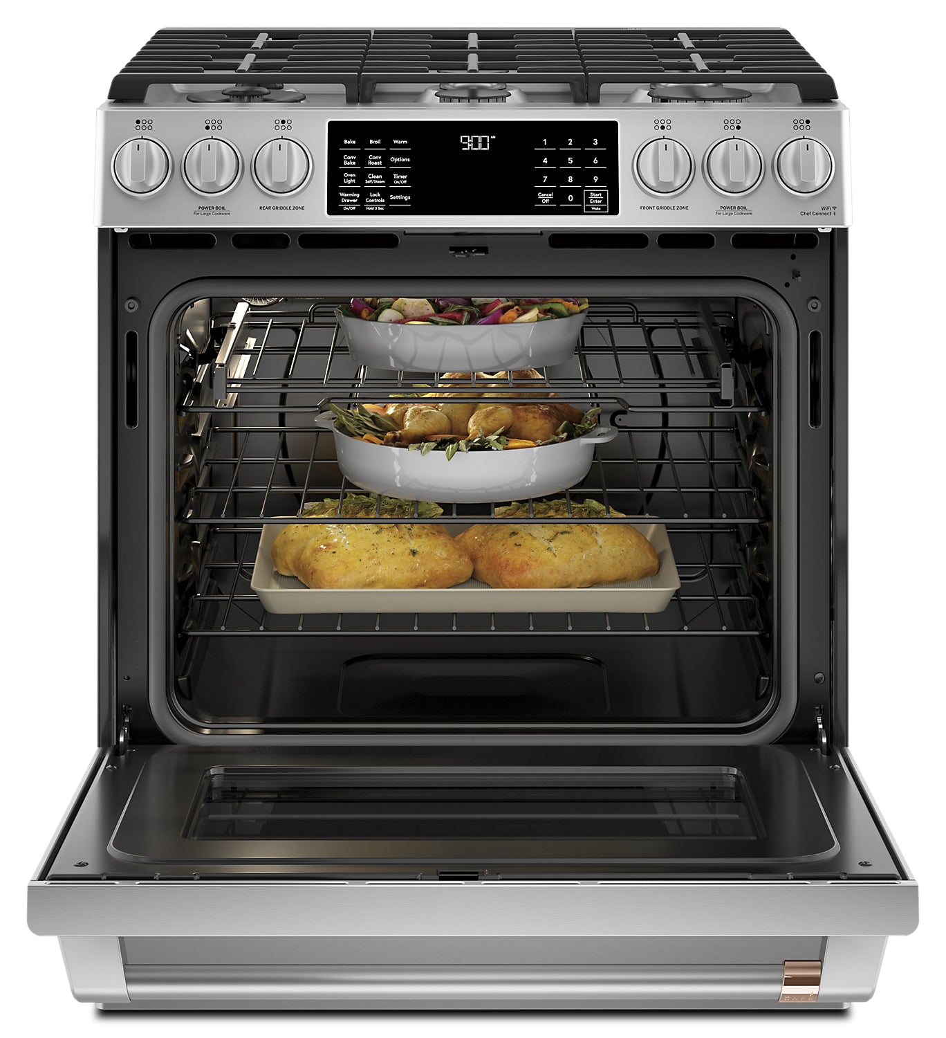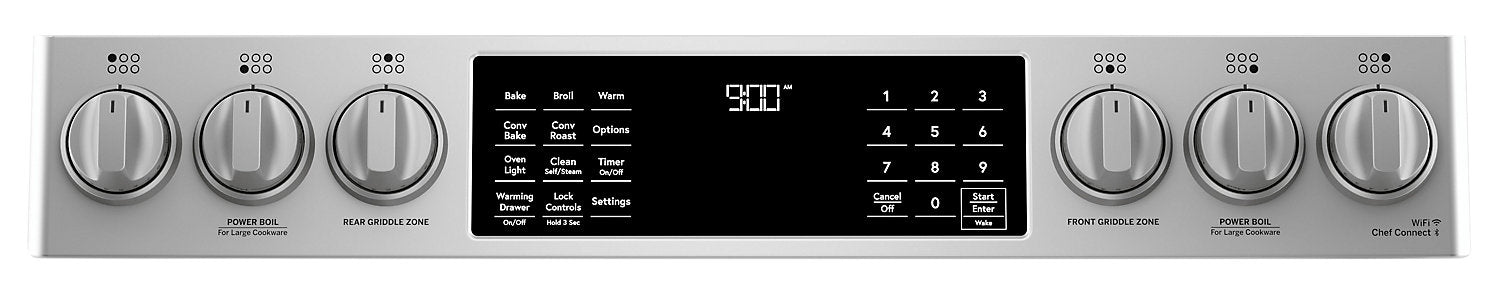 Poignées et boutons personnalisables : Surface de cuisson à six brûleurs d'une bordure à l'autre : Friture à air chaud: Connectivité Wi-Fi : Système de convection Precise AirMC : Tiroir-réchaud : |
