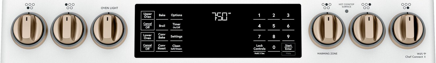 Surface de cuisson continue en verre d'une bordure à l'autre : Éléments polyvalents : Personnalisez votre décor : Convection avec Precise AirMC : Viandes parfaitement cuites : Panneau de commande : Connectivité Wi-Fi : Technologie Chef Connect : |