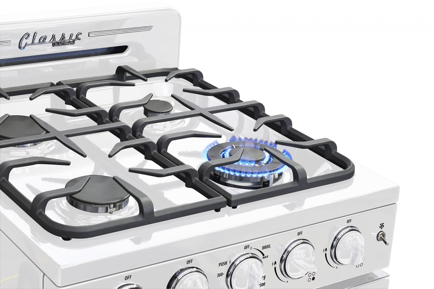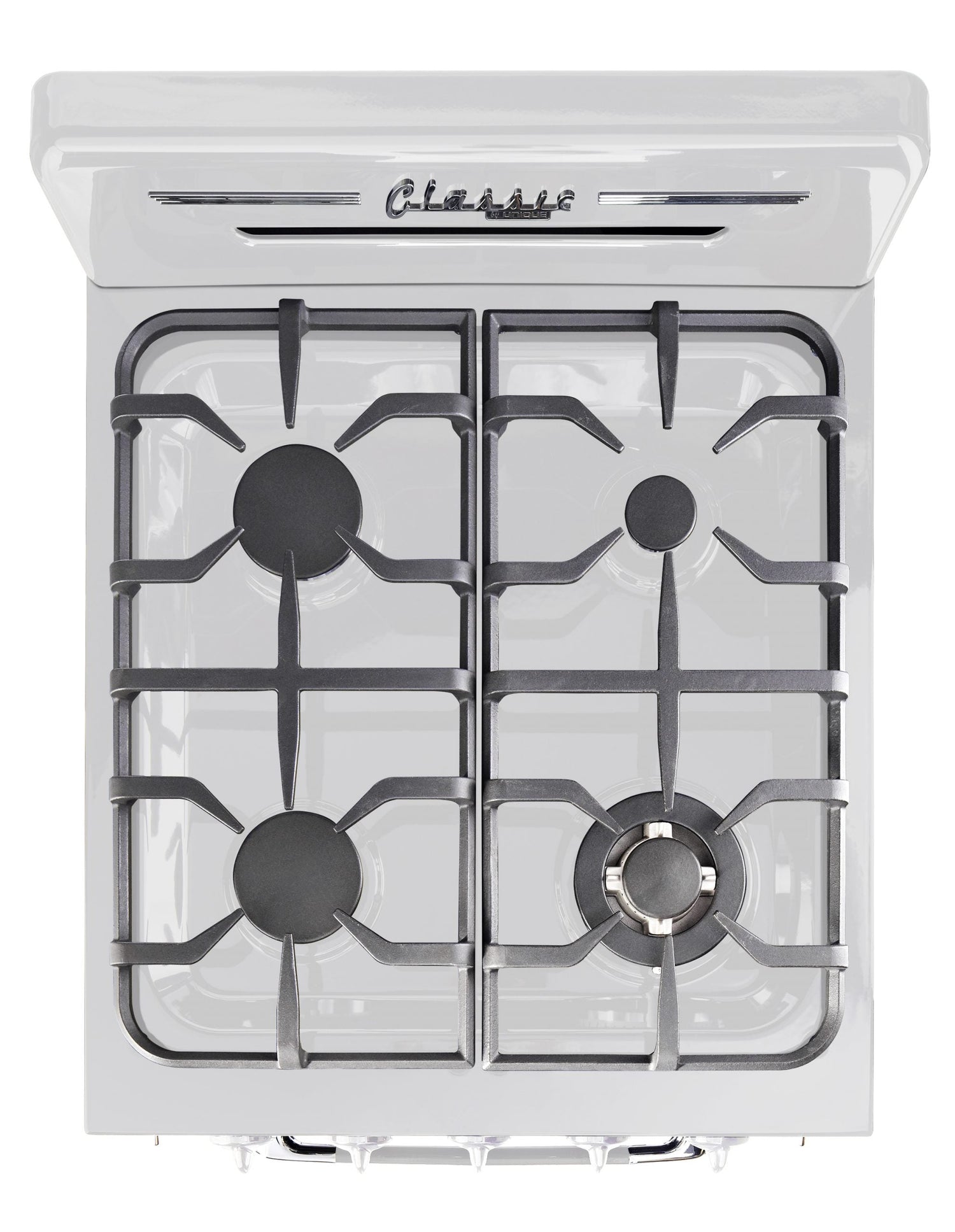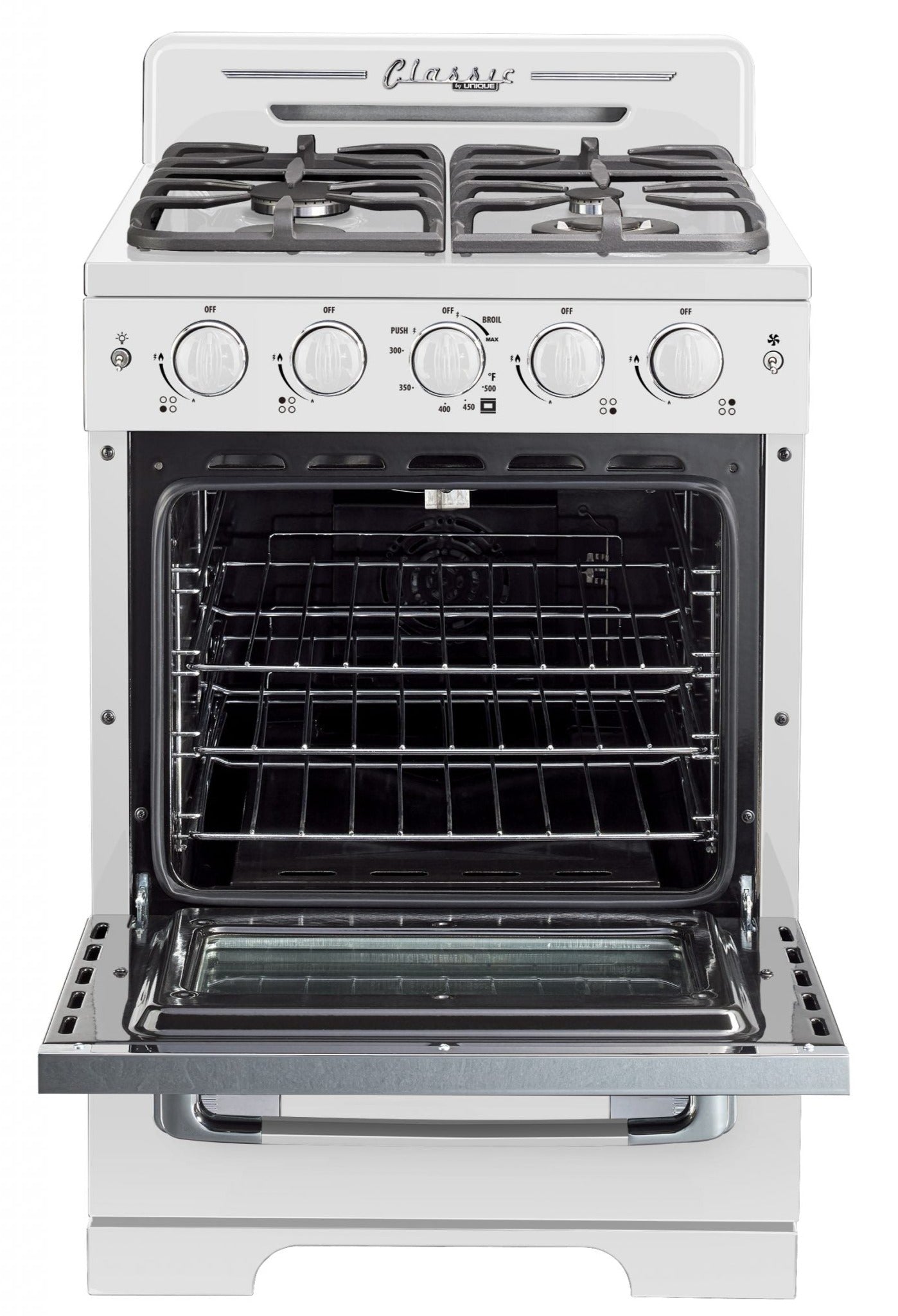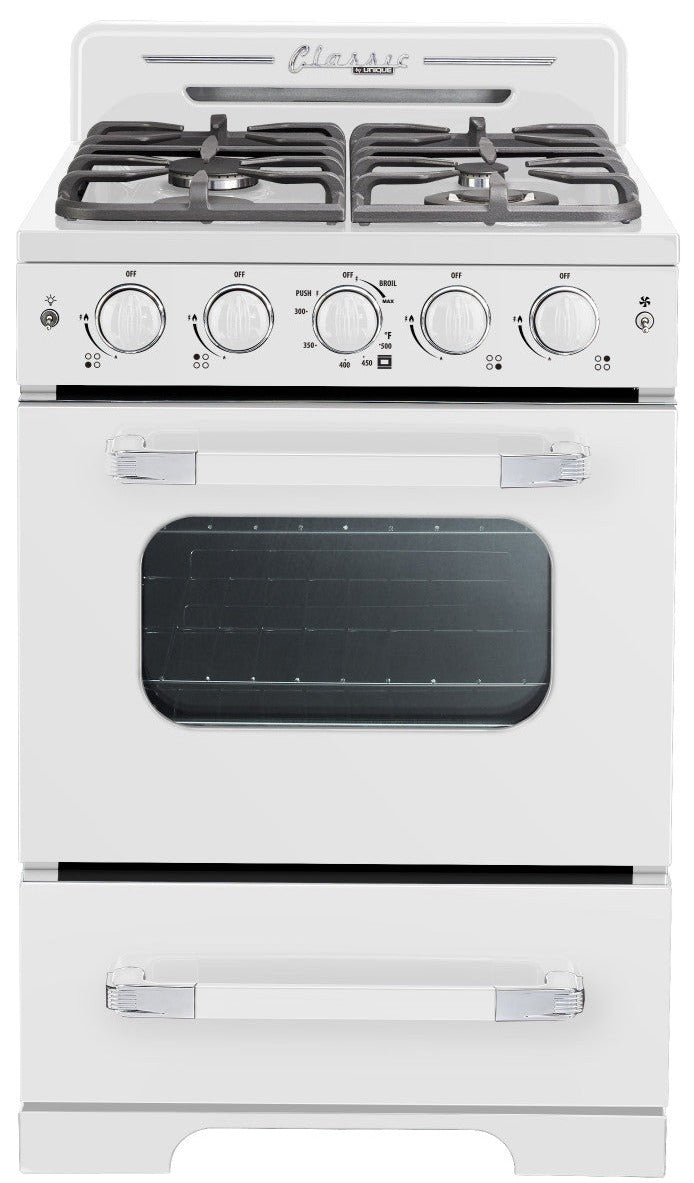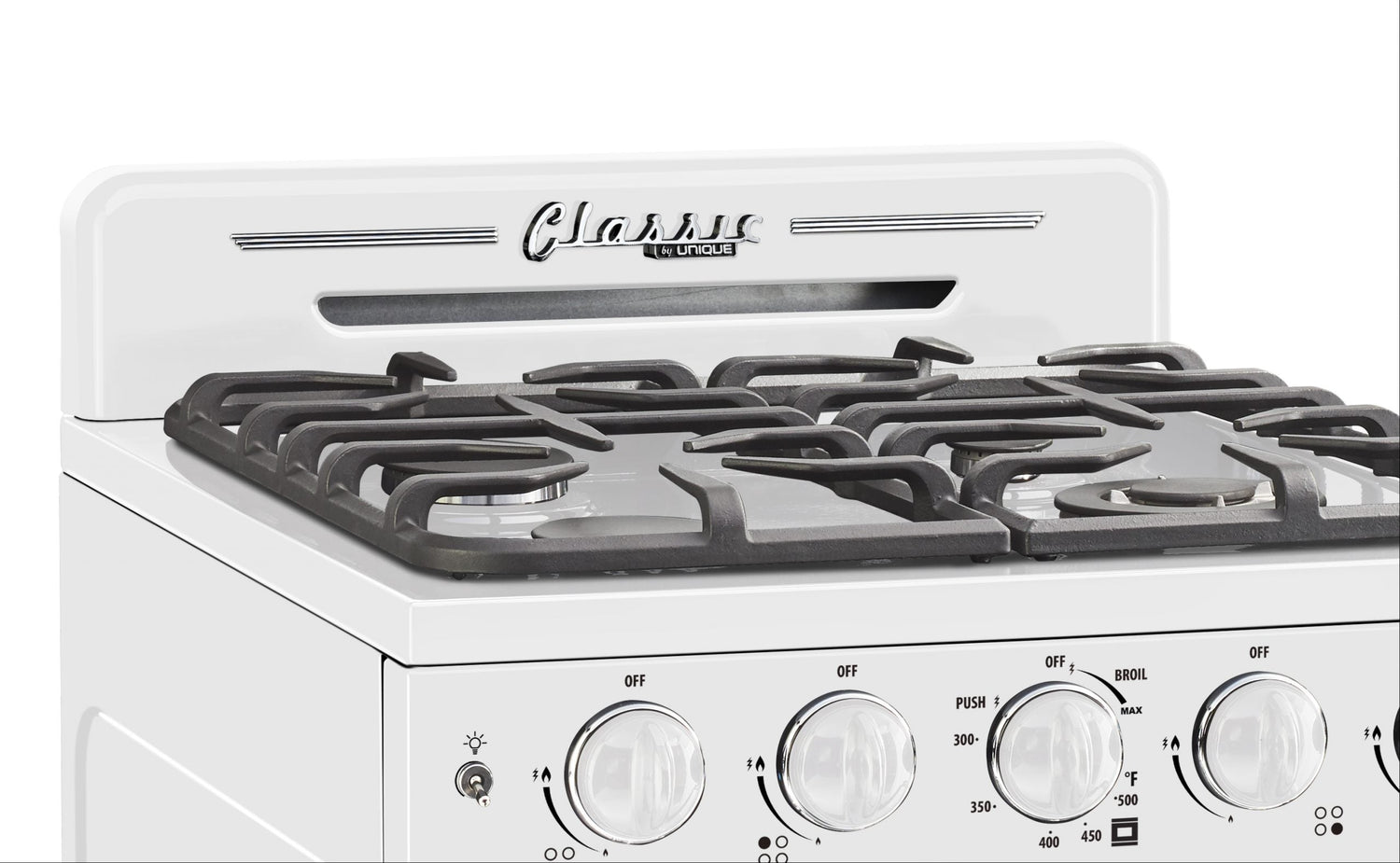 | Vendu séparément | Pour une apparence 1950 complète, jumelez-la à une hotte de cuisinière et à un réfrigérateur de Unique Appliances |