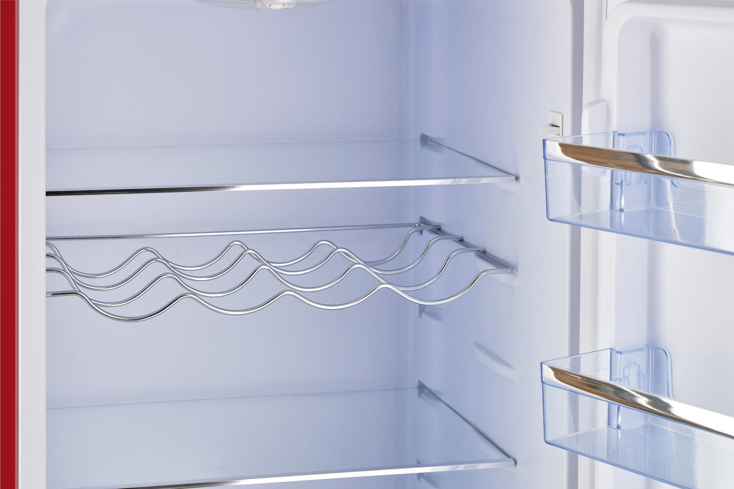| Tablettes dans le réfrigérateur | Support à vin réglable pour 4 bouteilles, 4 tablettes en verre réglables et 3 tablettes de portes réglables pleine largeur |