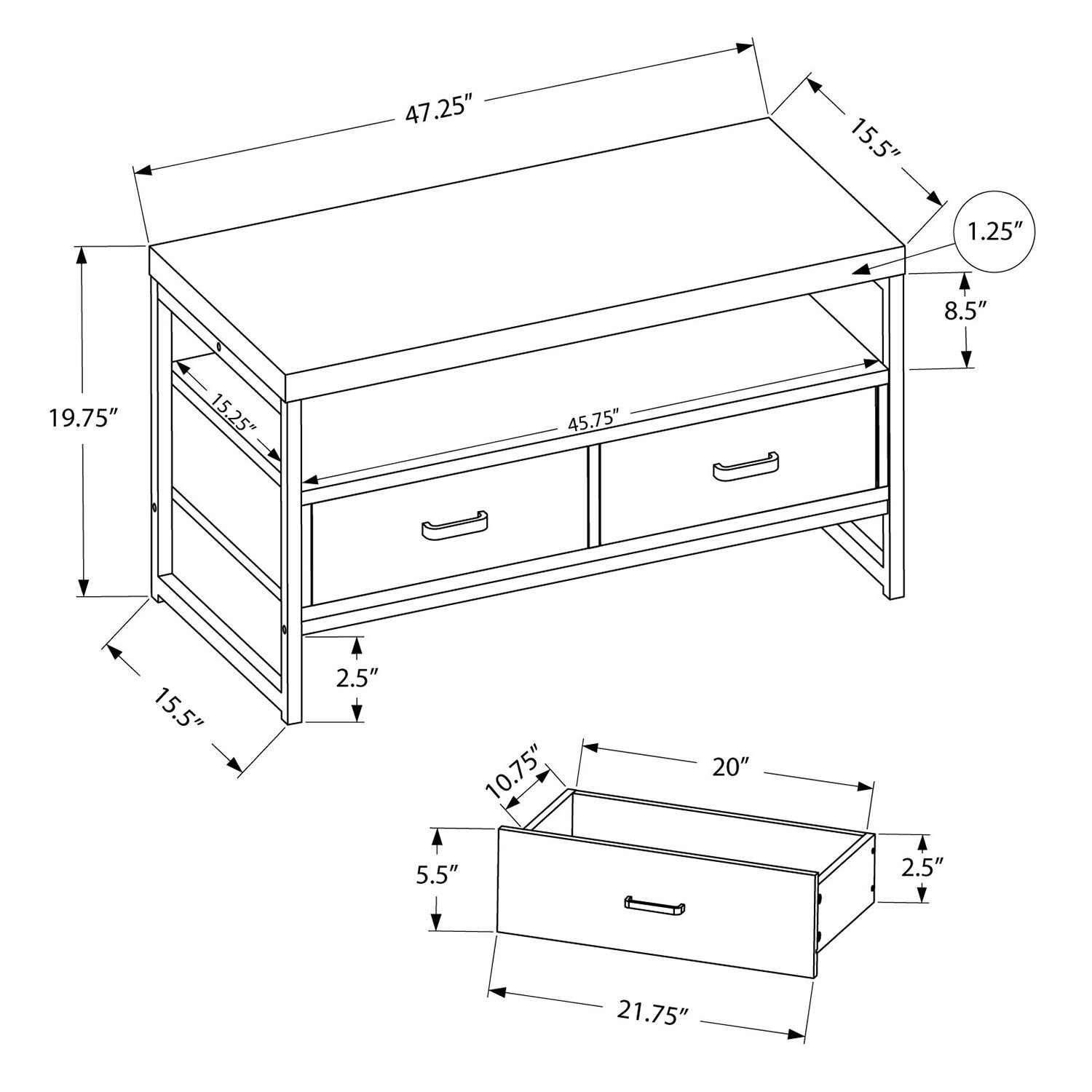 Largeur : 47,25 po (120,0 cm) Hauteur : 19,75 po (50,2 cm) Profondeur : 15,5 po (39,4 cm)