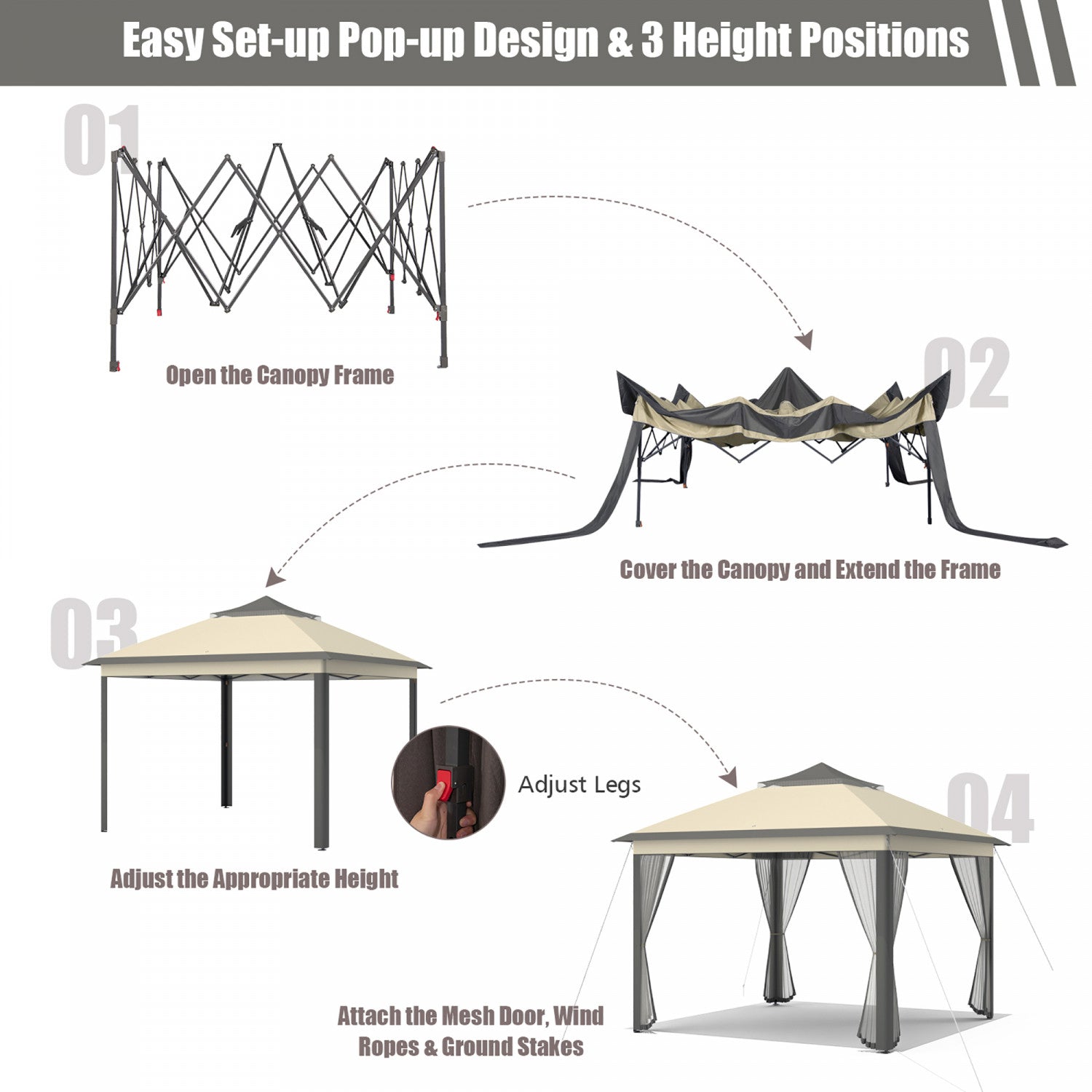 | Key Features | Le toit a Double ventilation favorise le flux d’air et fournit une bonne ventilation 3 niveaux de reglage de la hauteur differents repondent a vos divers besoins Le filet respirant vous protege du soleil et des insectes volants La corniche prolongee offre une couverture d’ombrage supplementaire Trous de Drainage pour empecher la tente de s’effondrer sous l’eau pendant les jours de pluie Equipe de cordes a vent et de piquets pour le maintenir stable par temps venteux Le cadre en acier recouvert de poudre est antirouille pour une longue durabilite Le tissu de polyester dur est impermeable et resistant a la decoloration Le sac de transport Portable le rendent approprie pour une utilisation en exterieur La conception Pop-up est facile a configurer en quelques etapes |