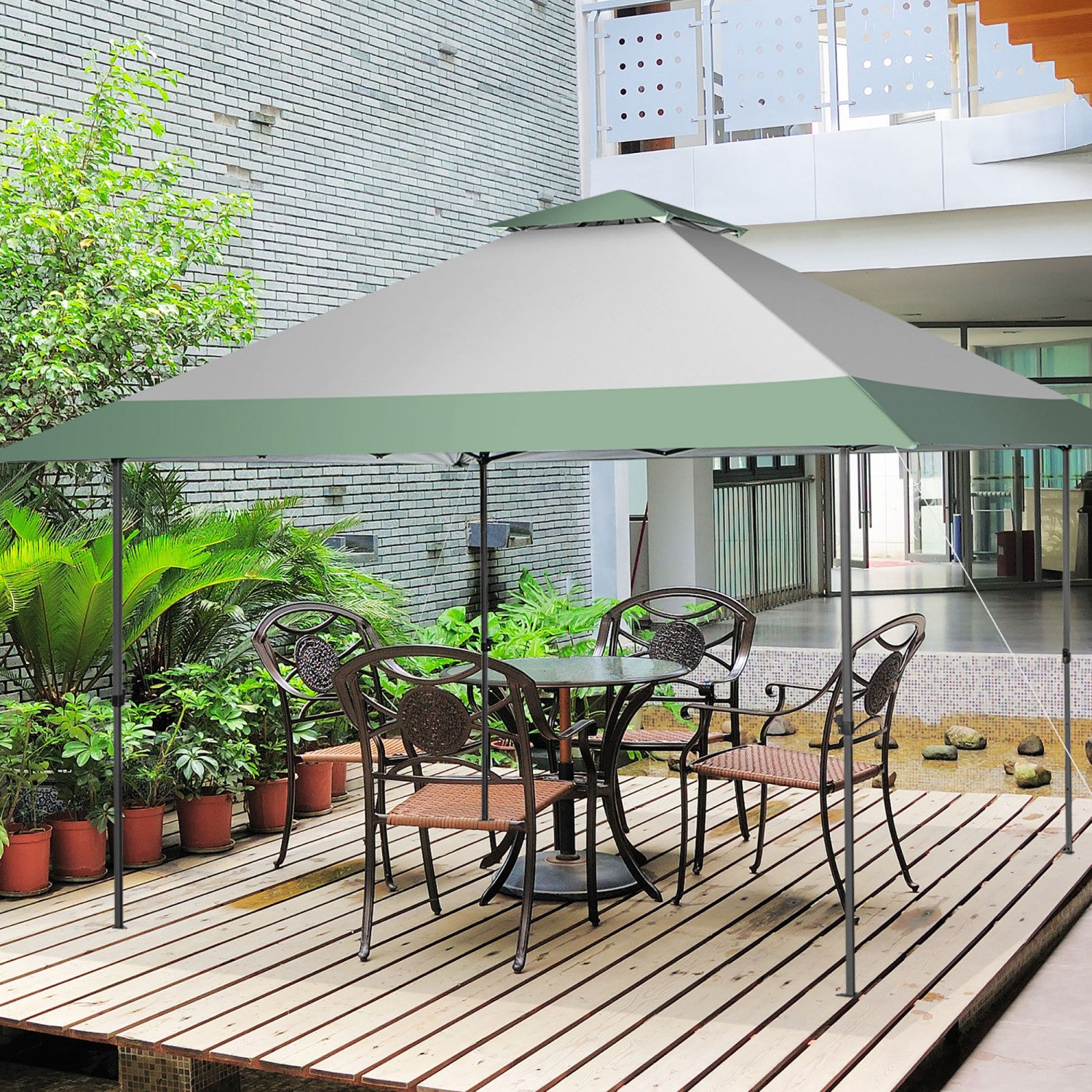 | Renseignements supplémentaires | Couleur: vert & gris Materiel: metal, 150D Oxford recouvert d’argent, PU, PVC Dimension hors-tout: 13ft x 13ft x 8ft/9ft/10ft (L x L x H) Dimension pliee: 0.8ft x 0.8ft x 4.5ft (L x W x H) Nombre approprie de personnes: 10 Poids Net: 47 lb < fr > Le forfait comprend: 1 x cadre acier 2 x auvents superieurs 1 x sac a roues 8 x piquets au sol 4 x fixer les cordes 1 x Guide de l’utilisateur |