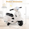 | Renseignements supplémentaires | Color: White Materials: PP, Metal Product Dimensions: 26" x 15" x 20" (L x W x H) Size of Seat: 10" x 6"(L x W) Net Weight: 10 lbs Max Weight: 55 lbs Suitable Ages: 18-36 Months Old Motor: 6V, 30W Battery: 6V, 4AH Speed: 1.6 mph Charger Input: AC120V, 0.2A, 60Hz Package Includes: 1 x Kids Ride on Motorcycle 1 x Charger 1 x User Guide |