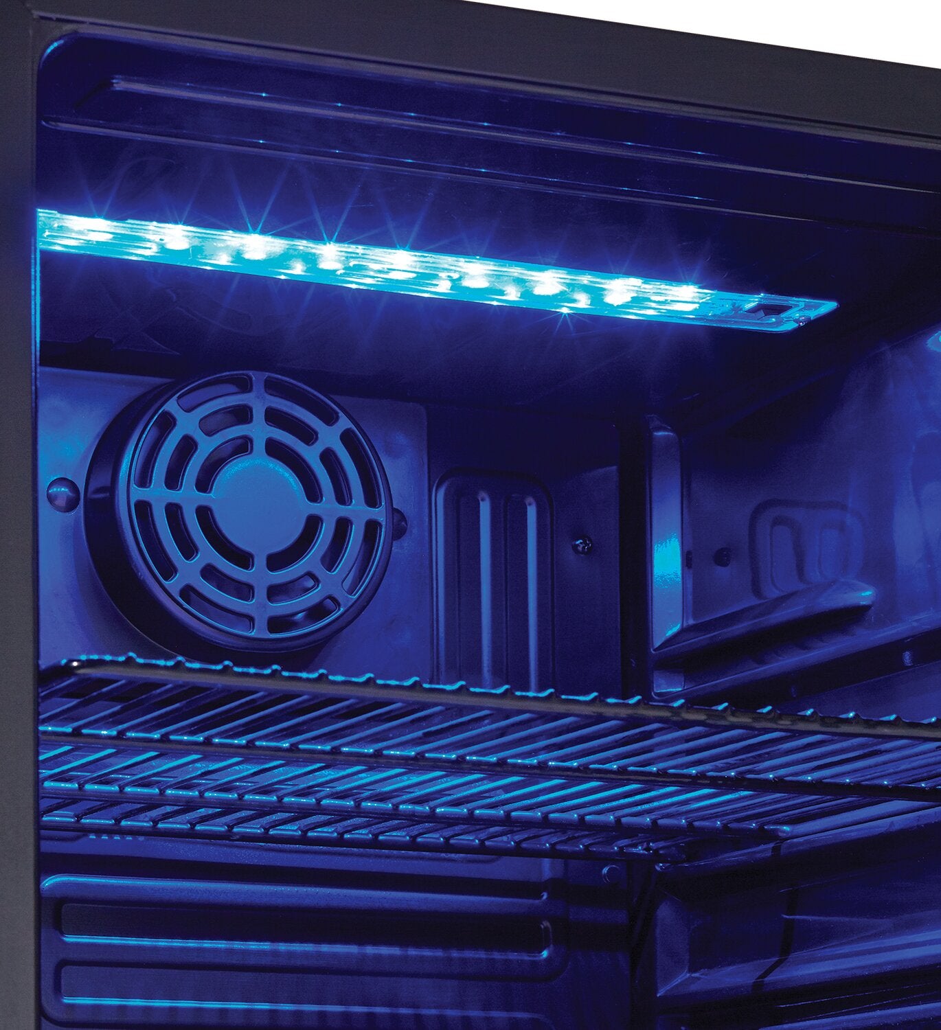 Refroidissement supérieur par ventilation : Porte réversible : Rangement personnalisé : Intérieur à DEL bleu : Joints de porte magnétiques : Capacité de 2,6 pi³ : |