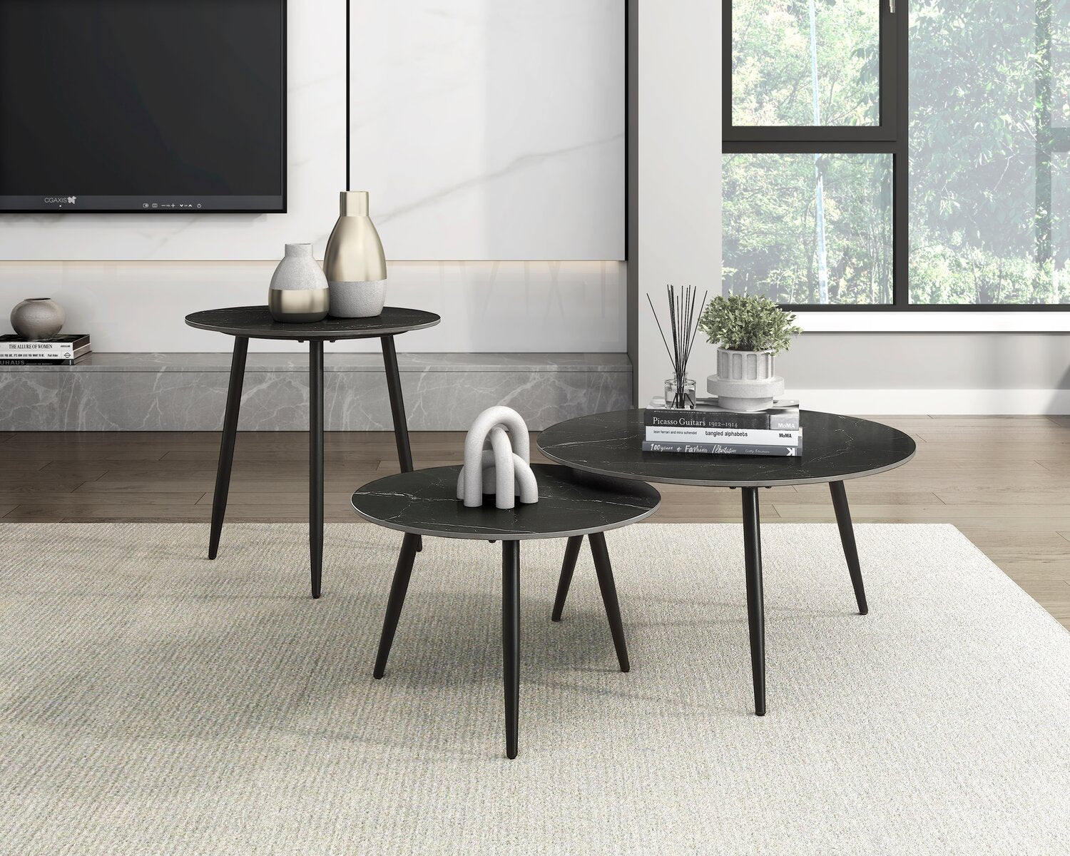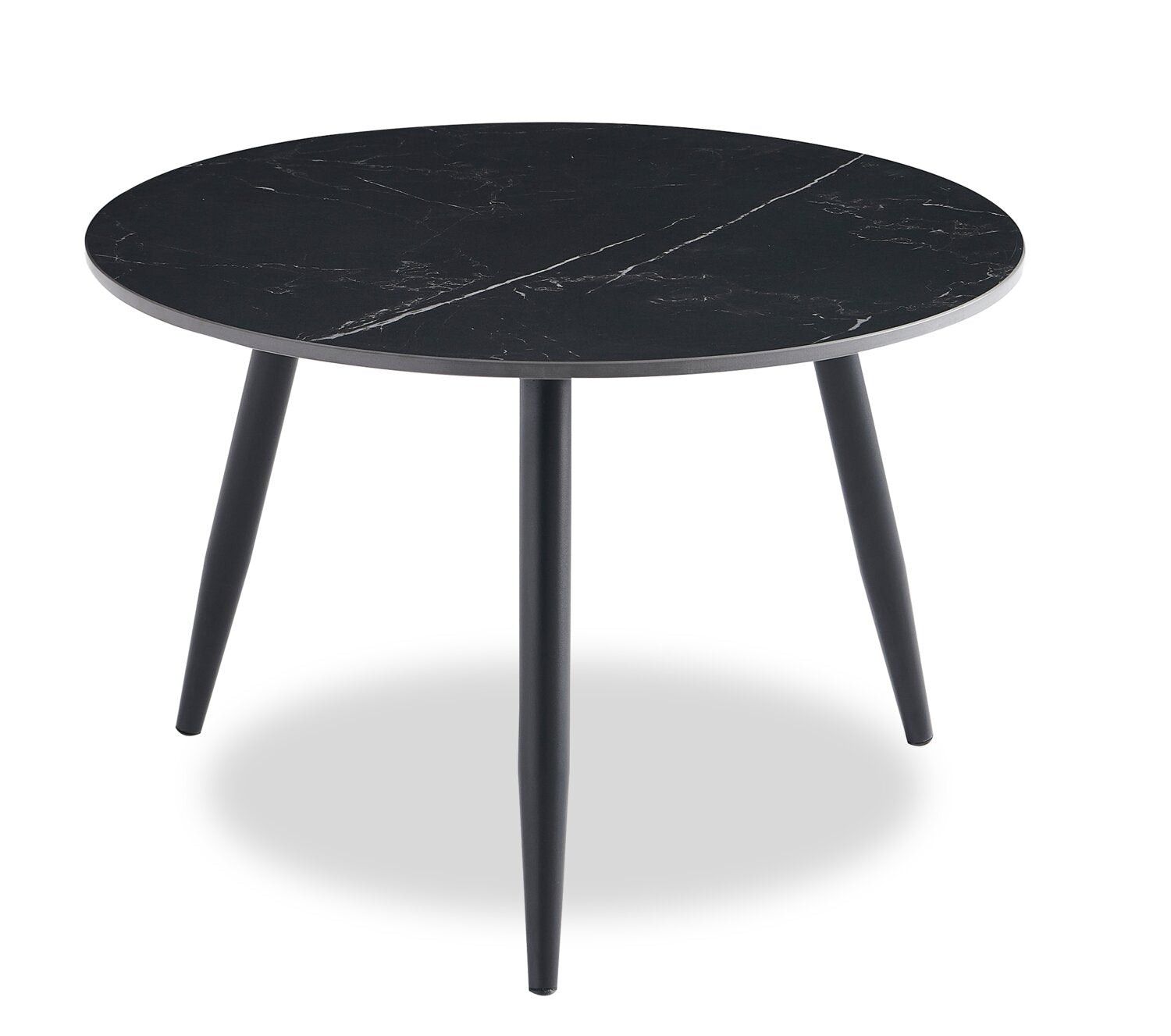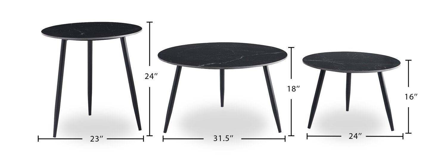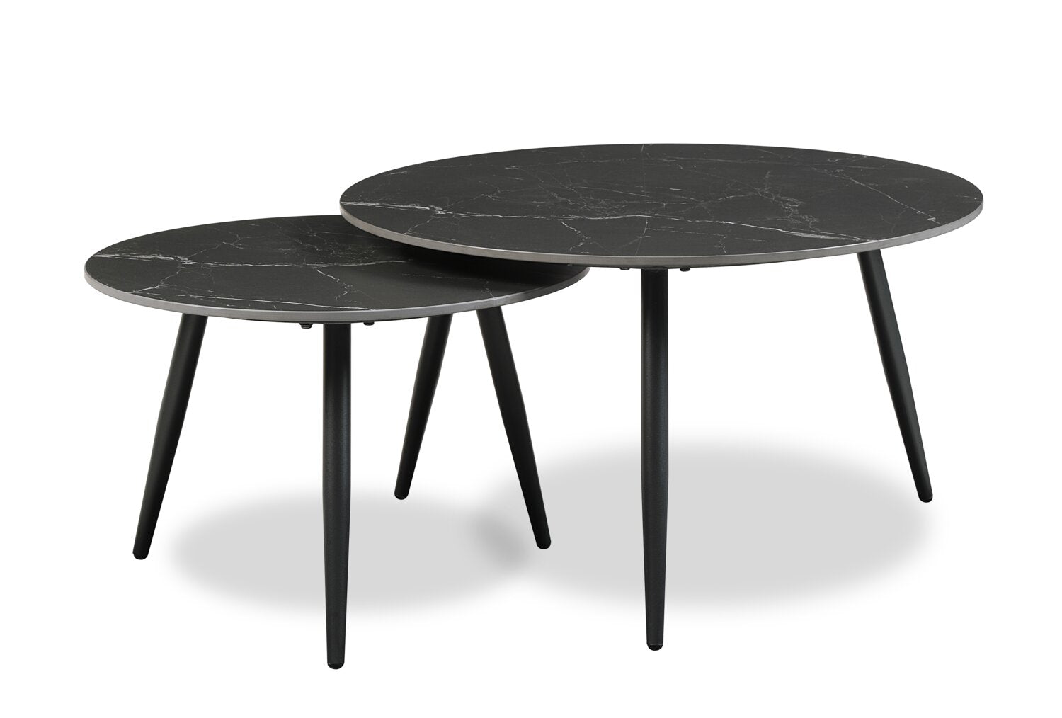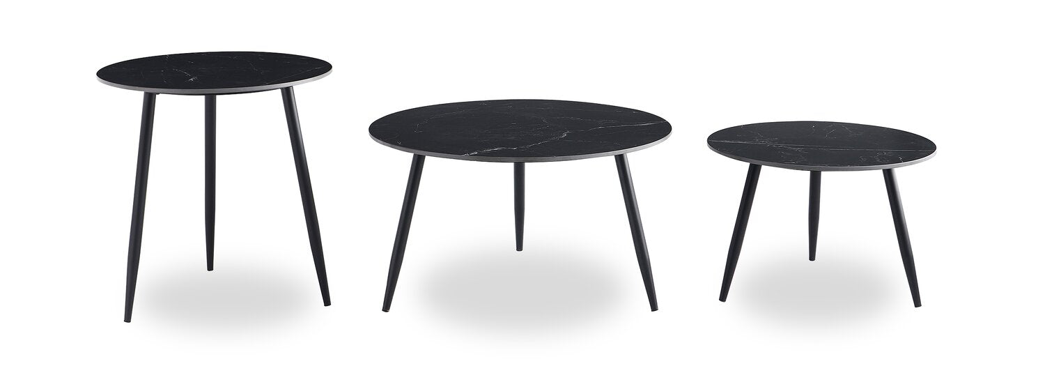 | Détails décoratifs | Le dessus en pierre frittée noire des tables arbore des veines blanches. |