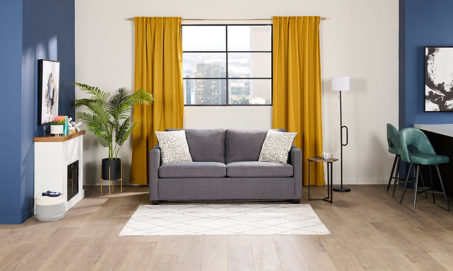 | Détails décoratifs | La teinte claire des coussins décoratifs s’agence bien au revêtement gris. |