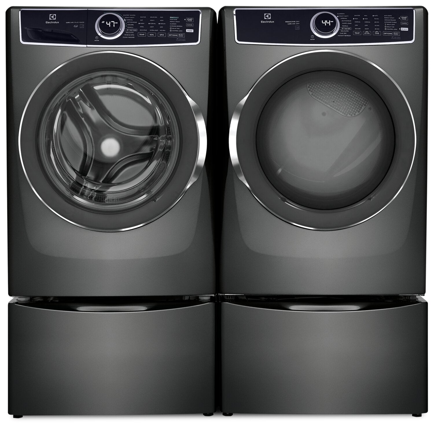 | Vendu séparément | Sécheuse électrique (ELFE753CAT), sécheuse à gaz (ELFG7537AT), piédestal de rangement (EPWD257UTT), ensemble de superposition optionnelle (STACKIT7X) |