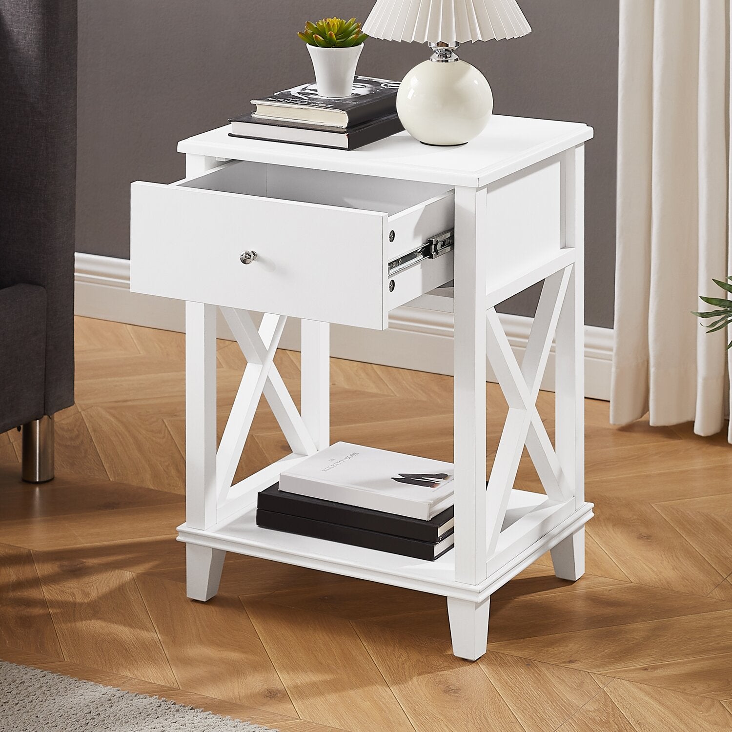 | Options de rangement | Gardez les essentiels de chevet à portée de main dans le grand tiroir unique et sur la tablette inférieure ouverte. |