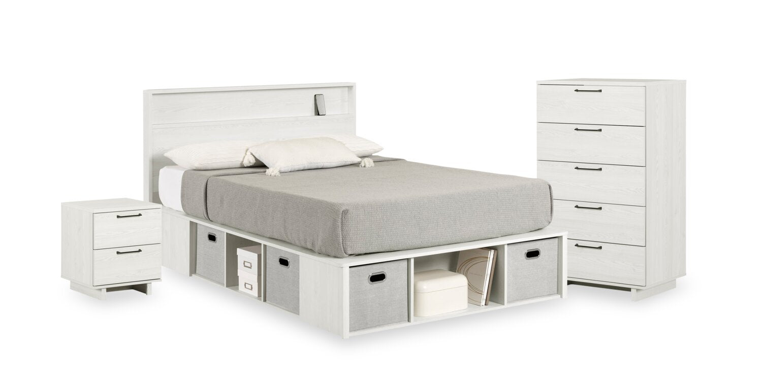 Ensemble lit plateforme et tête de lit à panneau Everley avec rangement et paniers intégrés, blanc - format lit double