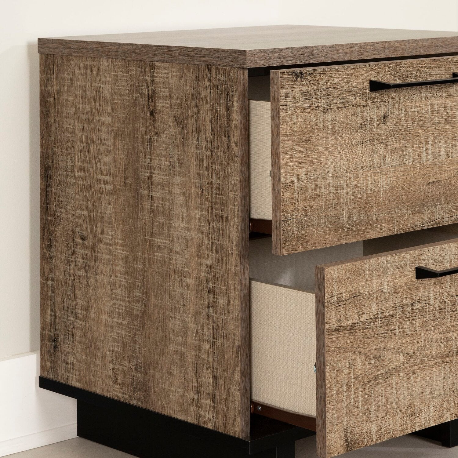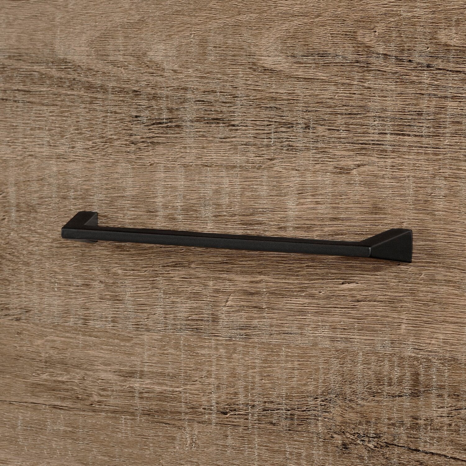 | Quincaillerie | Poignées en métal noir sur les tiroirs. |