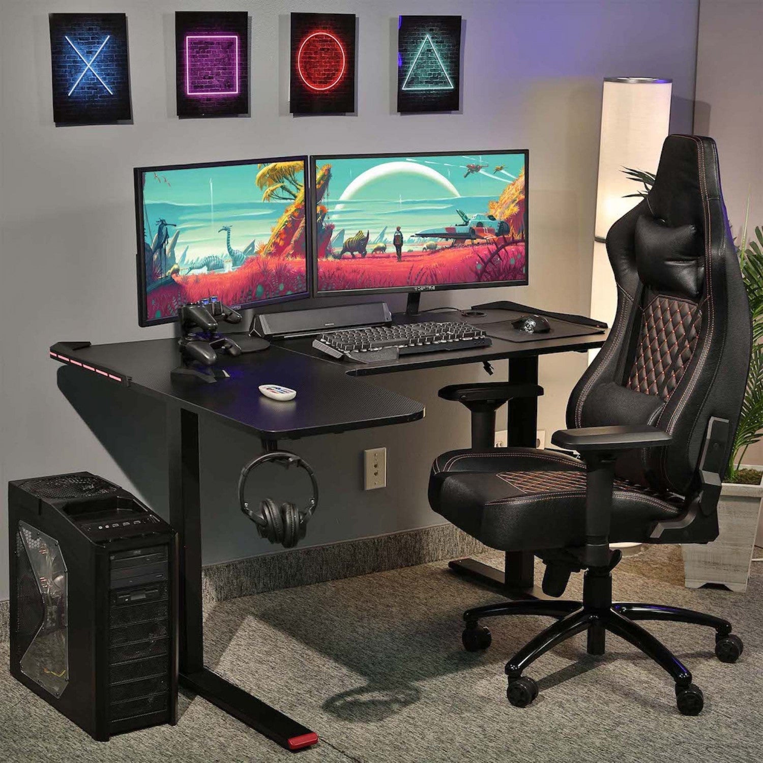 Améliorez votre expérience de jeu au moyen du bureau de jeu fixe Faze en forme de L. Ce bureau de jeu à économie d'espace et rempli de fonctions et procurera des heures de jeu confortable sans fatigue. Offrant une vaste surface ergonomique, le bureau de jeu Faze est idéal pour les joueurs qui aiment s'étendre au cœur d’une bataille. Sa fabrication solide possède une armature tubulaire en acier et un dessus de bureau stratifié en fibre de carbone qui peuvent soutenir des installations à multiples moniteurs, des claviers, une souris et n’importe quels autres accessoires nécessaires à un jeu épique. Le bureau Faze possède également un système de gestion des câbles discret pour accrocher des câbles et est équipé d’un crochet pour casque d'écoute, d’un porte-gobelet et d’un support à manette. Illuminez votre expérience de jeu grâce aux supports d'extension avec lumières DEL RVB détachables et gérez votre ambiance de jeu en utilisant les boutons intégrés aux supports d’extension.