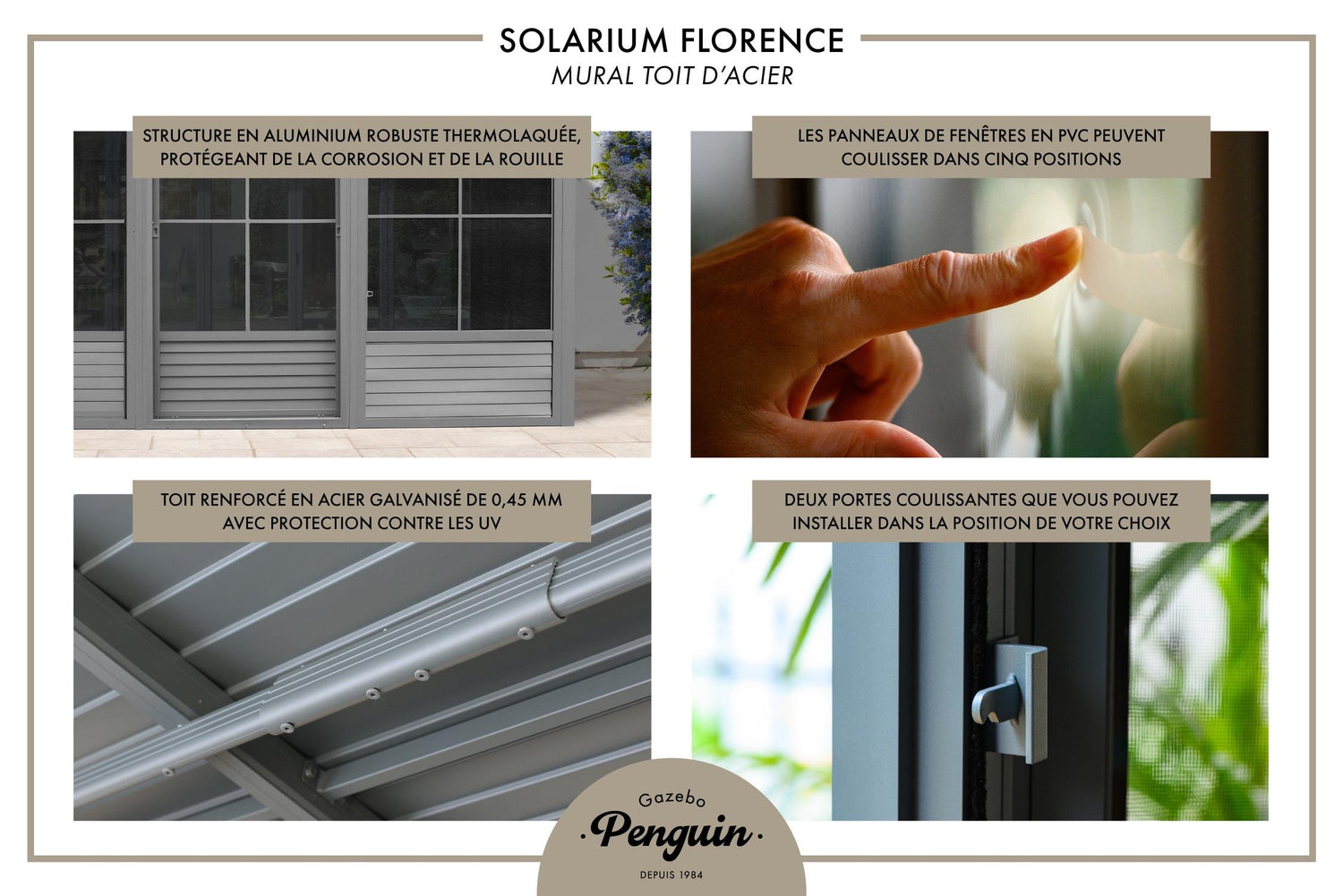 | • Structure en aluminium robuste thermolaquée, protégeant de la corrosion et de la rouille • Toit renforcé en acier galvanisé de 0,45 mm avec protection contre les UV • Les panneaux de fenêtres en PVC peuvent coulisser dans cinq positions pour permettre une circulation maximale de l'air • Deux portes coulissantes que vous pouvez installer dans la position de votre choix • Les deux extrémités des rails de la porte sont fermées pour empêcher les insectes de pénétrer à l’intérieur |