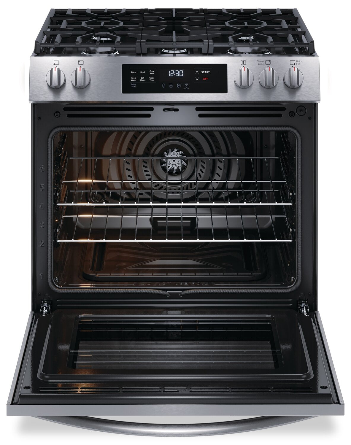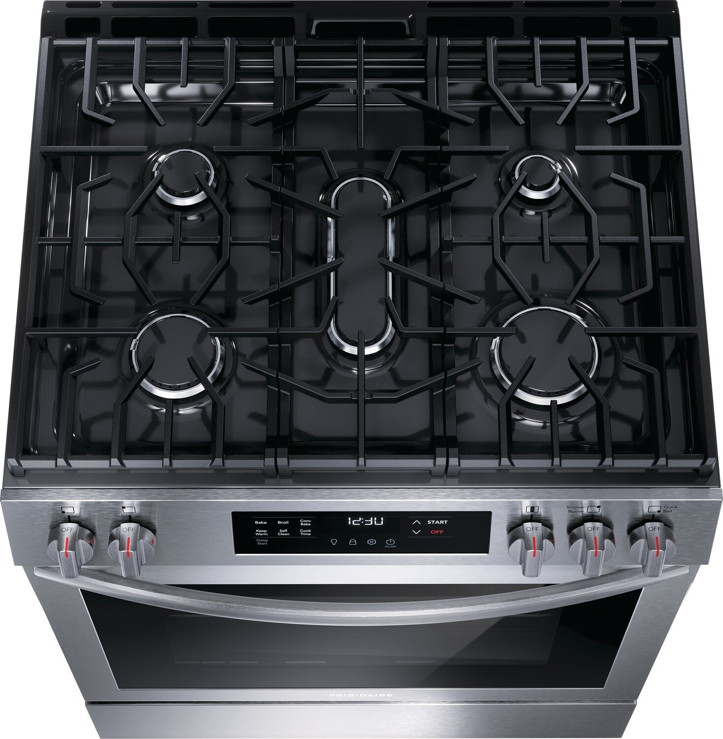 Cuisson à convection : Brûleur à ébullition rapide : Surface de cuisson polyvalente à cinq brûleurs : Autonettoyage à une touche : Grilles continues d'une bordure à l'autre : Apparence encastrée : Très grand tiroir de rangement Store-MoreMC : |