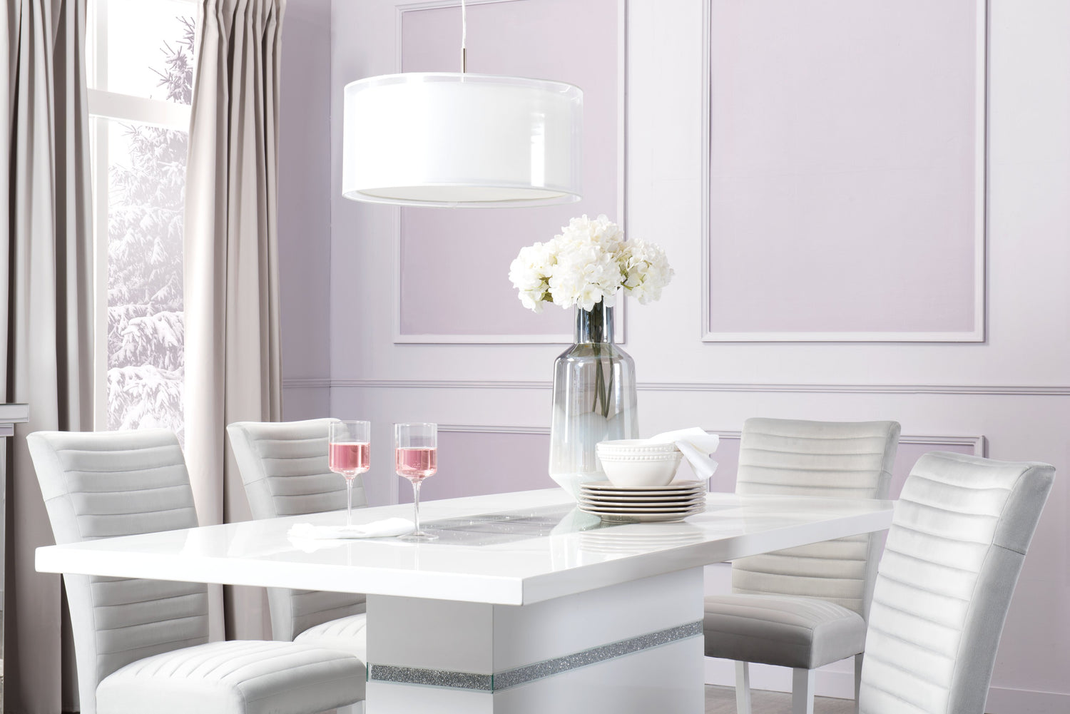 Ensemble de salle à manger somptueux Garbo 5 pièces avec table de 78,75 po (L), incrustation de verre, base piédestal et 4 chaises - blanc