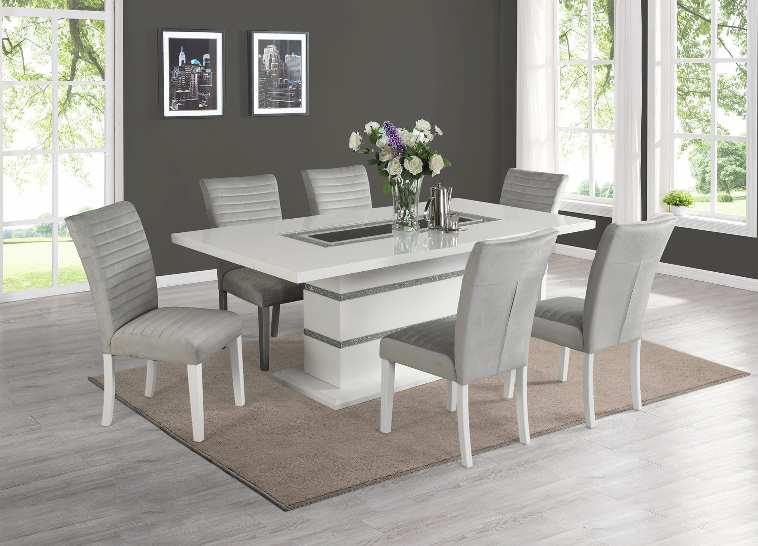 | Détails décoratifs | Deux bandes argentées s'enroulent autour de la base piédestal, tandis que les perles noires et argentées remplissent le centre du dessus de table. |