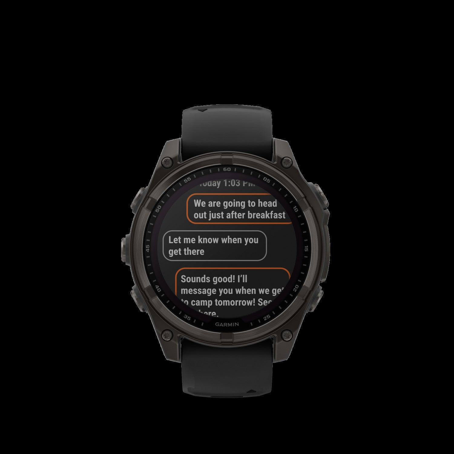 La montre intelligente GPS multisport fēnix® 8 est concue pour les athletes serieux et les aventuriers du plein air qui souhaitent repousser leurs limites. Il est dote d'un ecran charge a l'energie solaire de 1,3 pouces avec une lentille en saphir resistante aux rayures, d'une lunette en titane durable et d'une puissante lampe de poche LED integree pour une visibilite nocturne. Un haut-parleur et un micro integres vous permettent de passer et de recevoir des appels depuis votre poignet lorsque votre montre est couplee a votre smartphone. Renforcez les performances, l’endurance et la resistance de votre corps aux blessures grace a des plans d’entrainement en force cibles et a une gamme complete d’entrainements specifiques au sport. Les informations sur les performances vous aident a gerer votre effort et a developper votre endurance, tandis que les fonctionnalites de preparation a l'entrainement indiquent le temps de recuperation dont vous avez besoin entre les entrainements, sur la base d'une surveillance 24h/24 et 7j/7 de votre sante et de votre bien-etre, de la frequence cardiaque, de la respiration, du stress, du sommeil et bien plus encore (les donnees presentees sont destinees a etre une estimation precise des mesures suivies). Partez sur les sentiers avec les capteurs ABC integres et les cartes TopoActive prechargees. La fonction d'itineraire dynamique aller-retour permet de simplifier la planification de vos courses ou balades, vous permettant de definir votre distance cible et de recevoir des instructions etape par etape qui s'ajustent pour vous ramener a votre depart dans les delais. Profitez d'aventures prolongees hors reseau grace a l'energie solaire offrant jusqu'a 92 heures d'autonomie en mode GPS (en supposant une utilisation continue pendant toute la periode dans des conditions de 50 000 lux). De plus, une plongee de 40 metres et des boutons metalliques etanches vous permettent d'atteindre de nouvelles profondeurs d'aventure. Les fonctionnalites supplementaires incluent le stockage de musique, les paiements sans contact Garmin Pay™ (avec un pays et un reseau de paiement pris en charge), les notifications intelligentes (smartphone compatible requis) et bien plus encore.