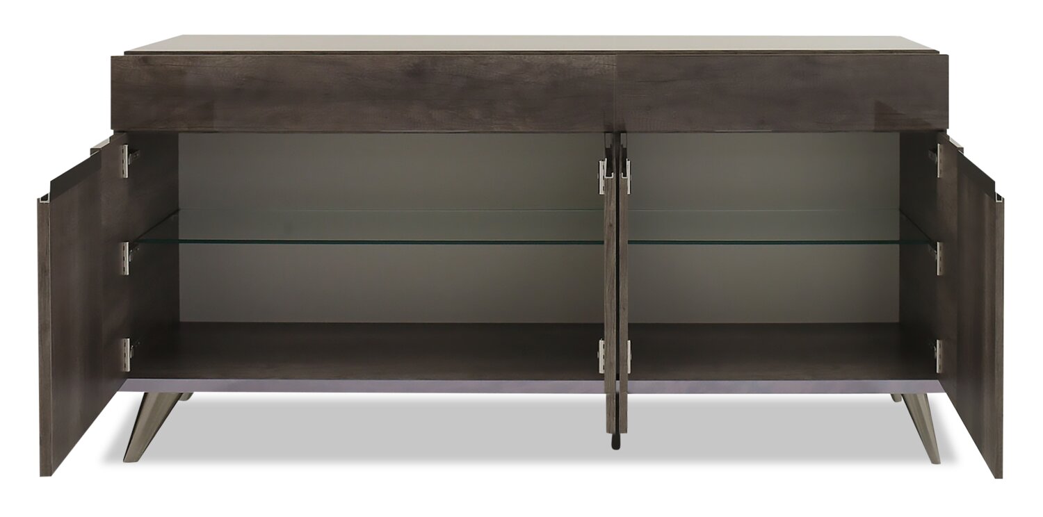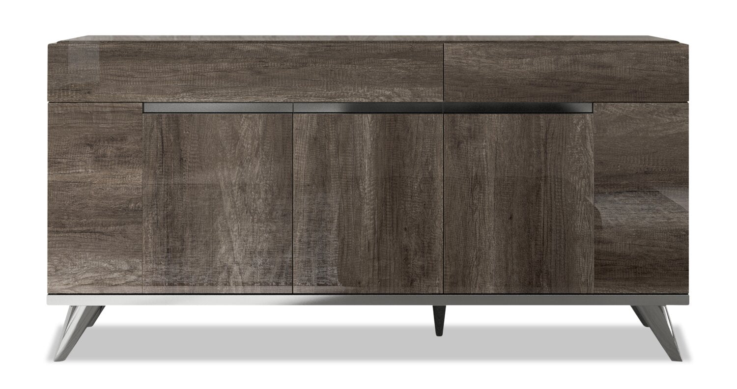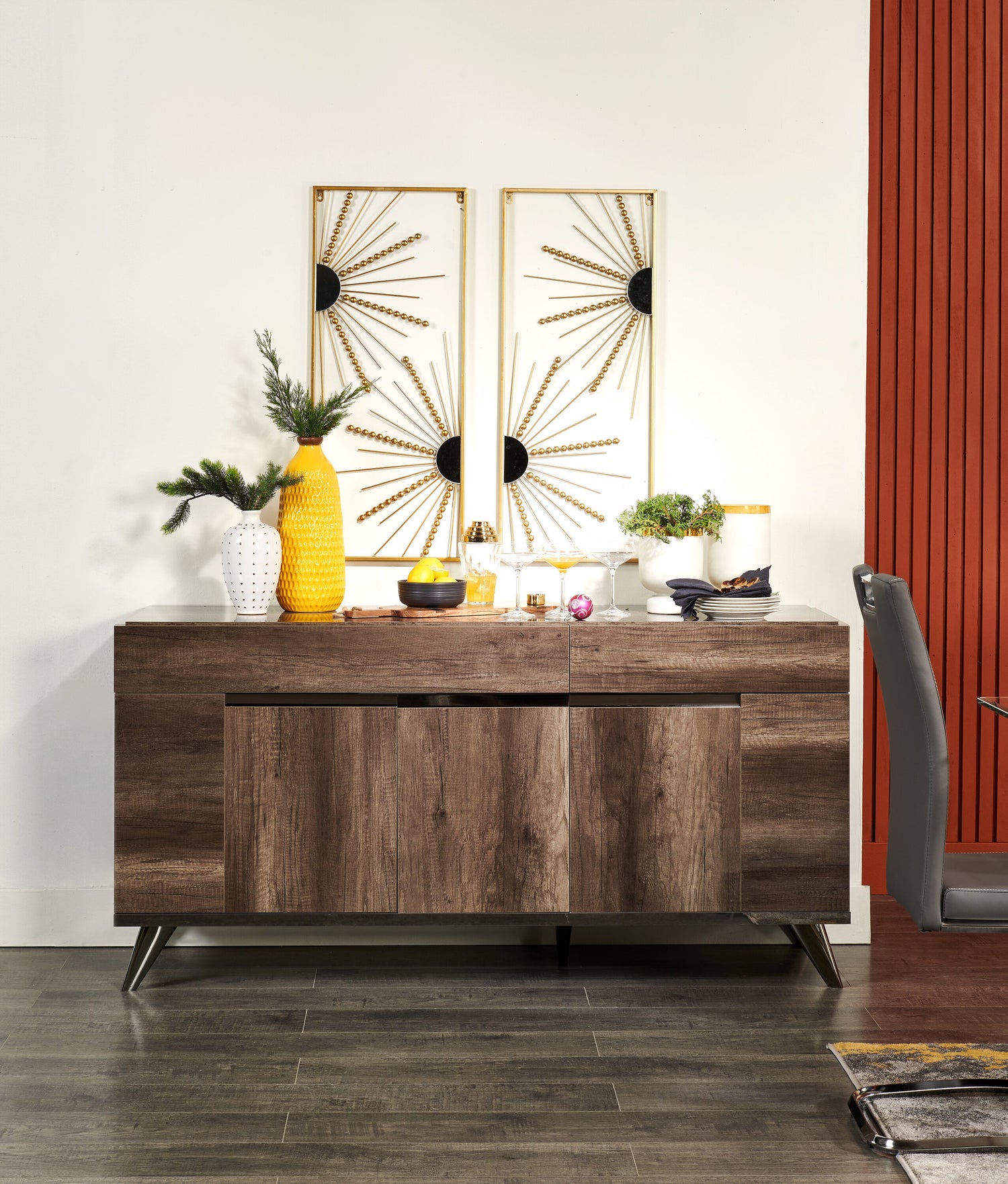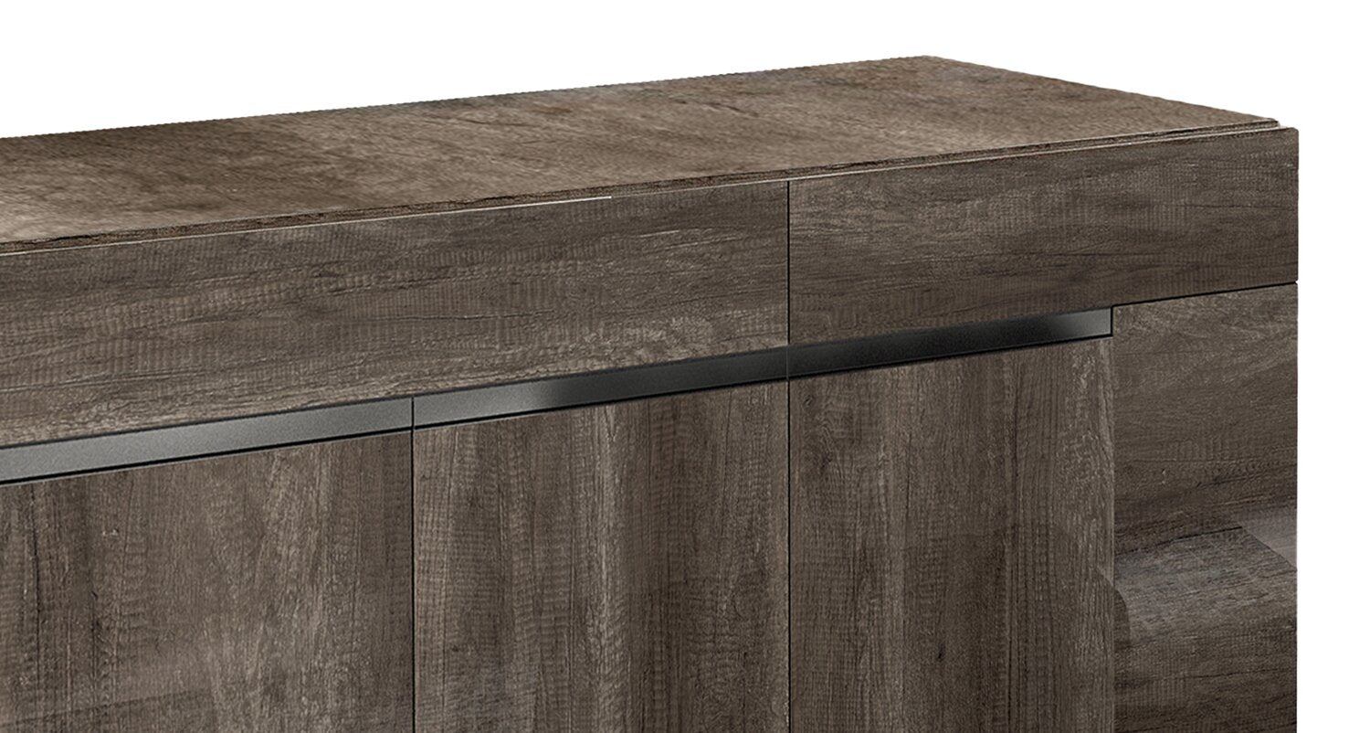 | Détails décoratifs | Les pattes et les touches chromées sur les portes apportent une touche de somptuosité à la desserte. |