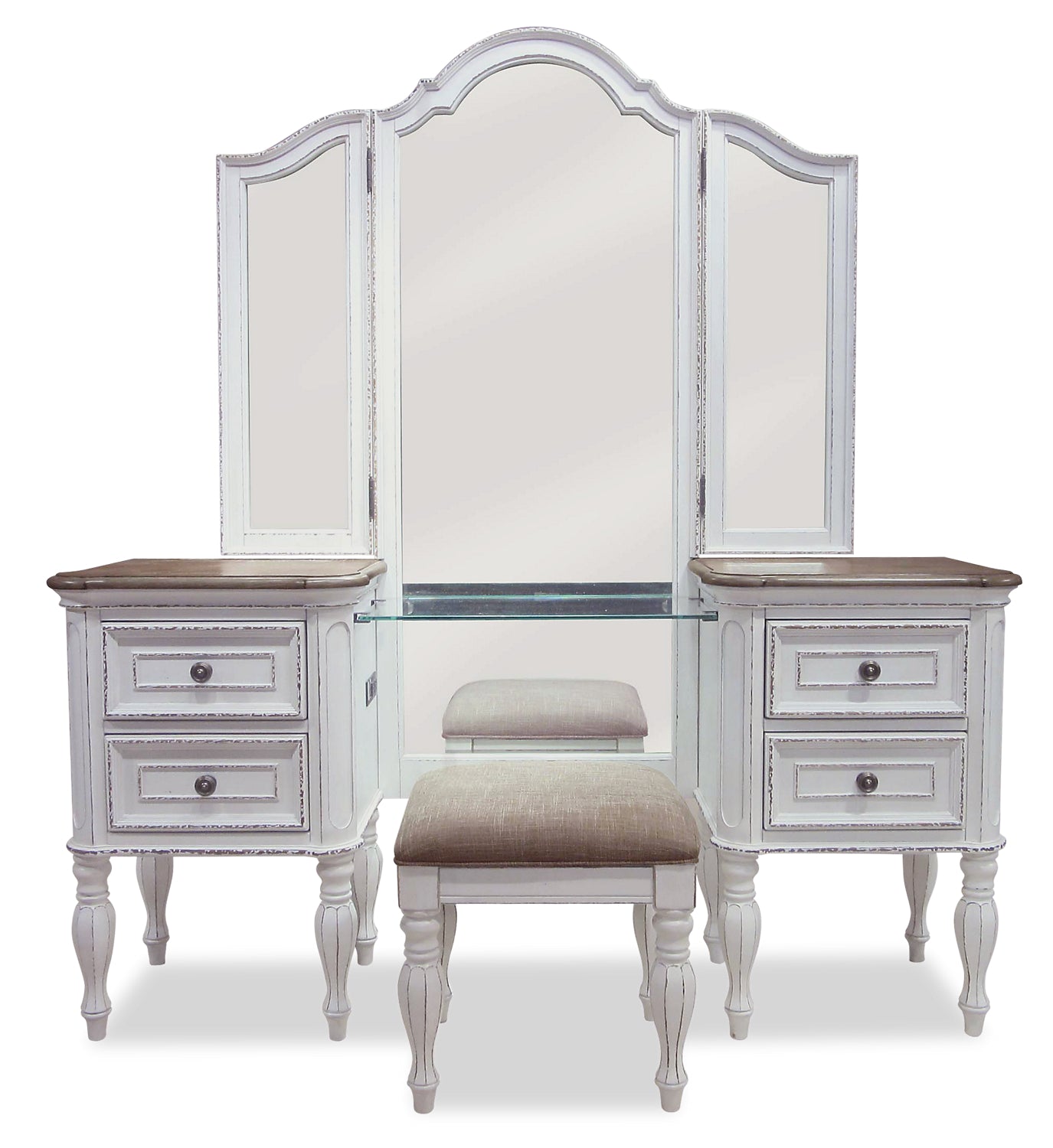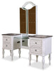 | Options de rangement | La coiffeuse inclut 4 tiroirs et 1 tablette en verre. Le siège se soulève pour révéler un petit compartiment. |