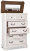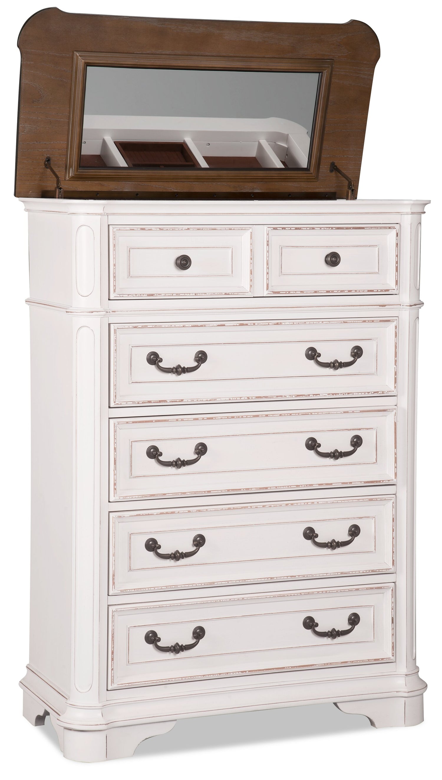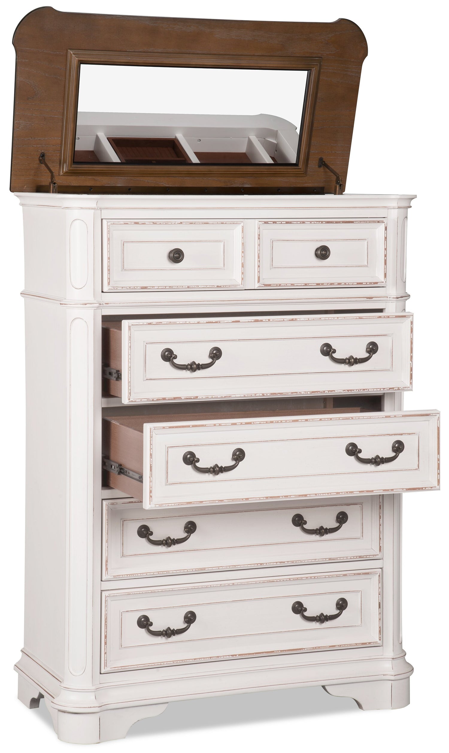 | Options de rangement | Cinq tiroirs, plus un plateau à bijoux intégré dans le dessus relevable. |