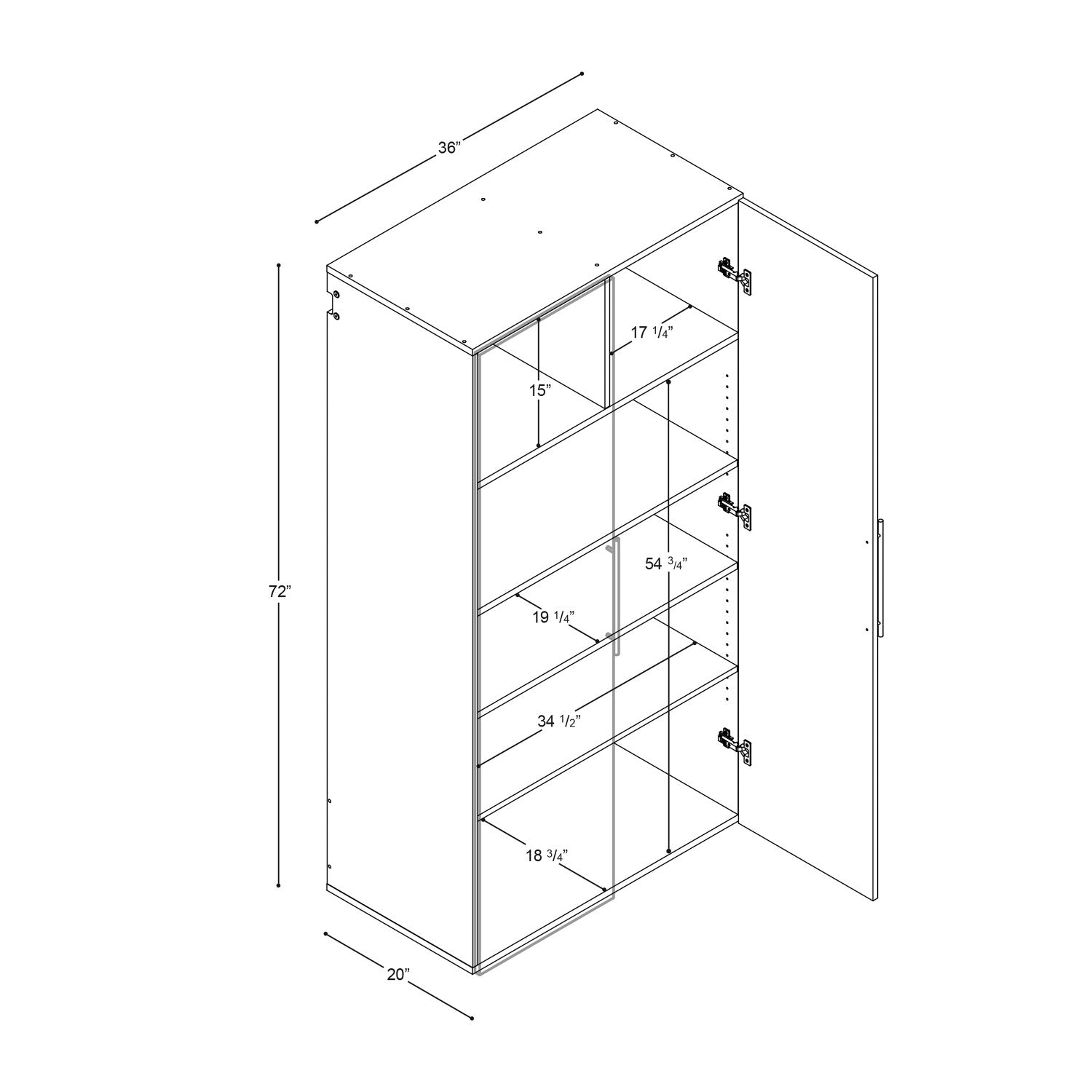 Largeur : 36 po (91,4 cm) Hauteur : 72 po (182,9 cm) Profondeur : 20 po (50,8 cm)