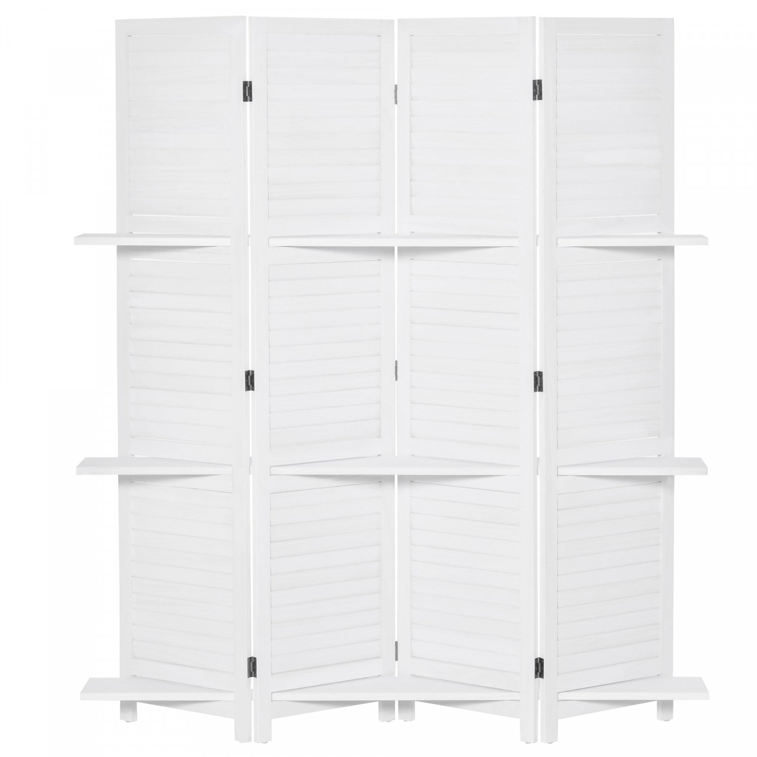 | Key Features | ● Structure en bois massif avec style stores finition blanche pour une structure robuste et un look elegant ● Conception pliable avec 4 panneaux, facile a deplacer et a ranger ● Y compris 3 etageres pour plus de stabilite et un espace supplementaire pour le stockage ● Pieds sureleves avec coussinets pour une meilleure circulation de l'air et une stabilite accrue ● Aucun assemblage requis |