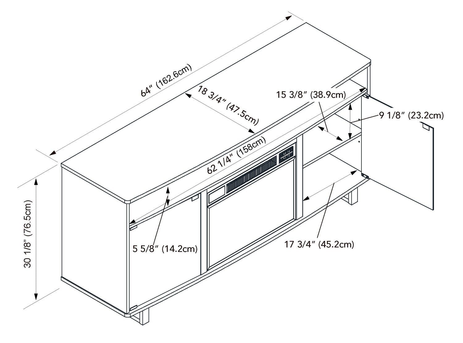 Largeur : 64 po (162,6 cm) Hauteur : 30,1 po (76,5 cm) Profondeur : 18,7 po (47,5 cm)