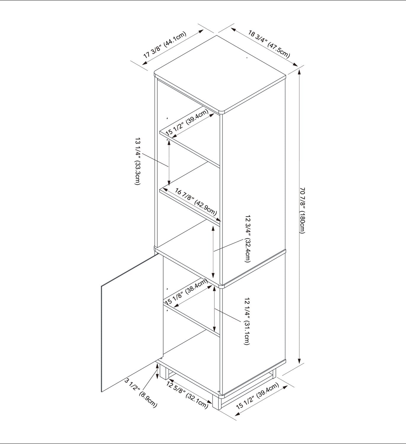 Largeur : 18,7 po (47,5 cm) Hauteur : 70,87 po (180,0 cm) Profondeur : 17,36 po (44,1 cm)