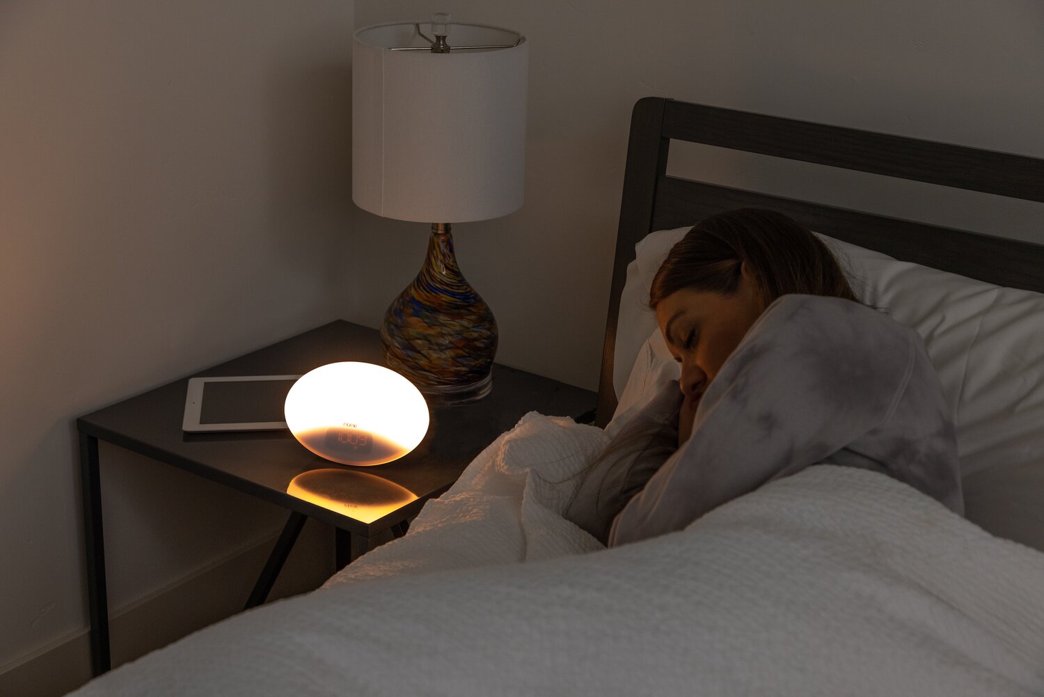 Coach de respiration 4-7-8 : Réveil au lever du soleil : Veilleuse de lecture : 15 pistes de thérapie par le son : Audio Bluetooth : Doubles alarmes : |