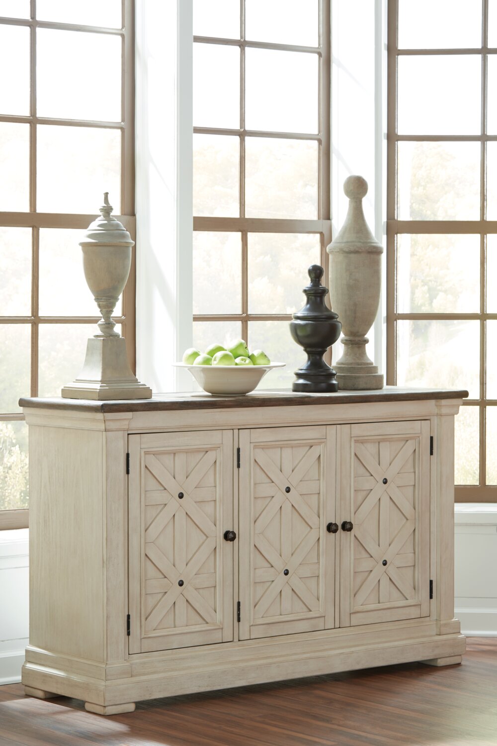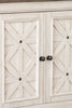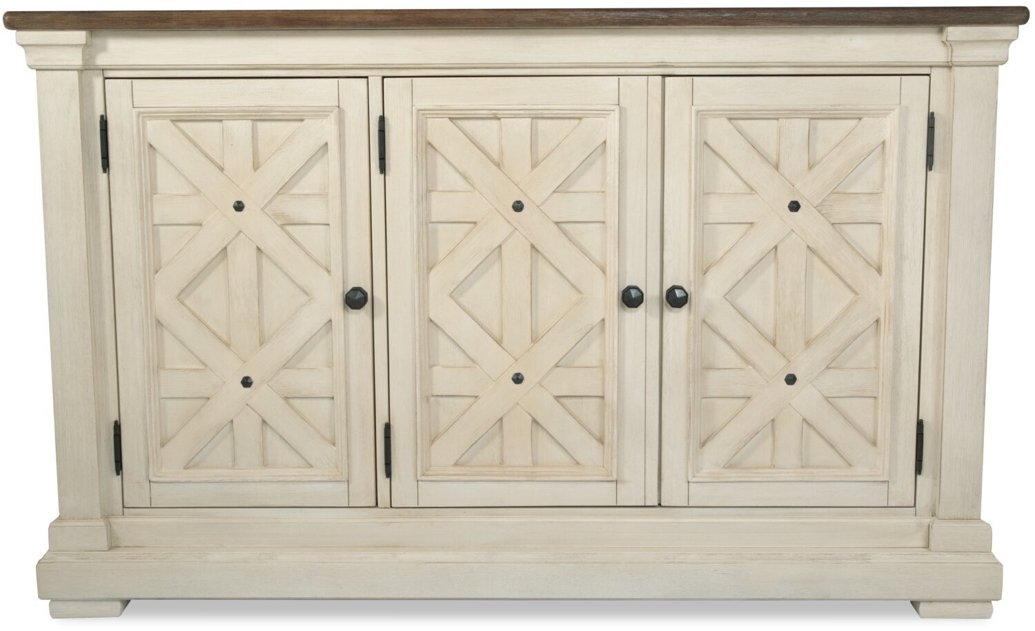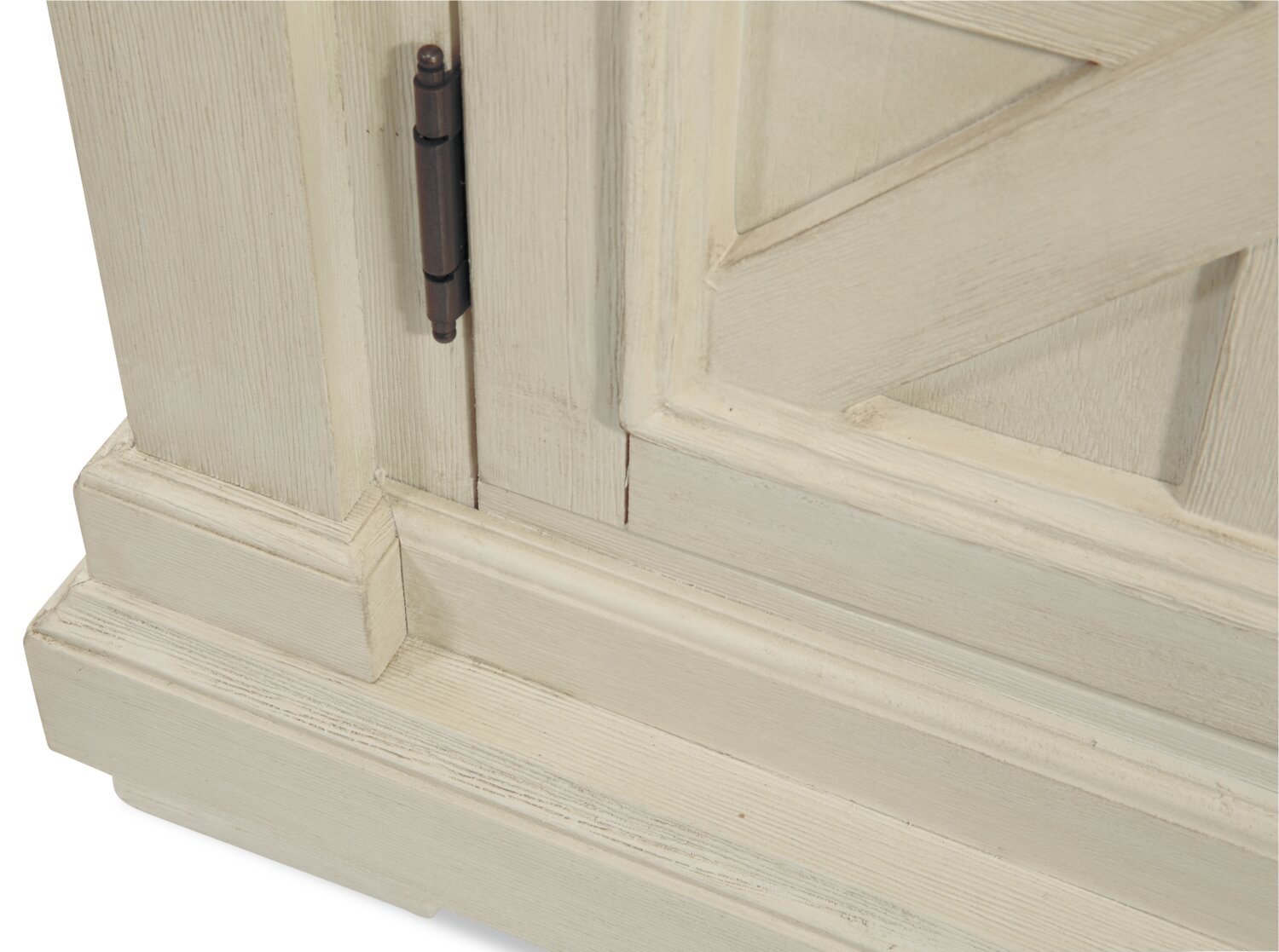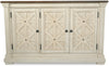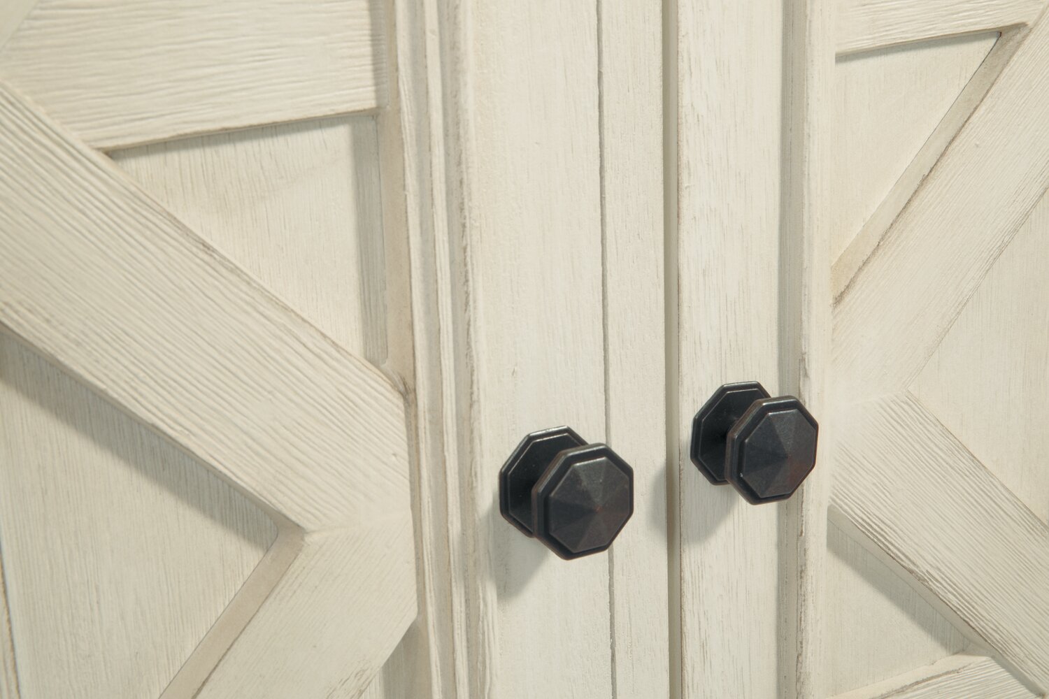 | Détails décoratifs | Des motifs en treillis entrecroisés et des clous décoratifs en métal noir créent des motifs de marguerites remarquables sur les portes d’armoires, tandis qu’une moulure couronnée accentue la surface. |